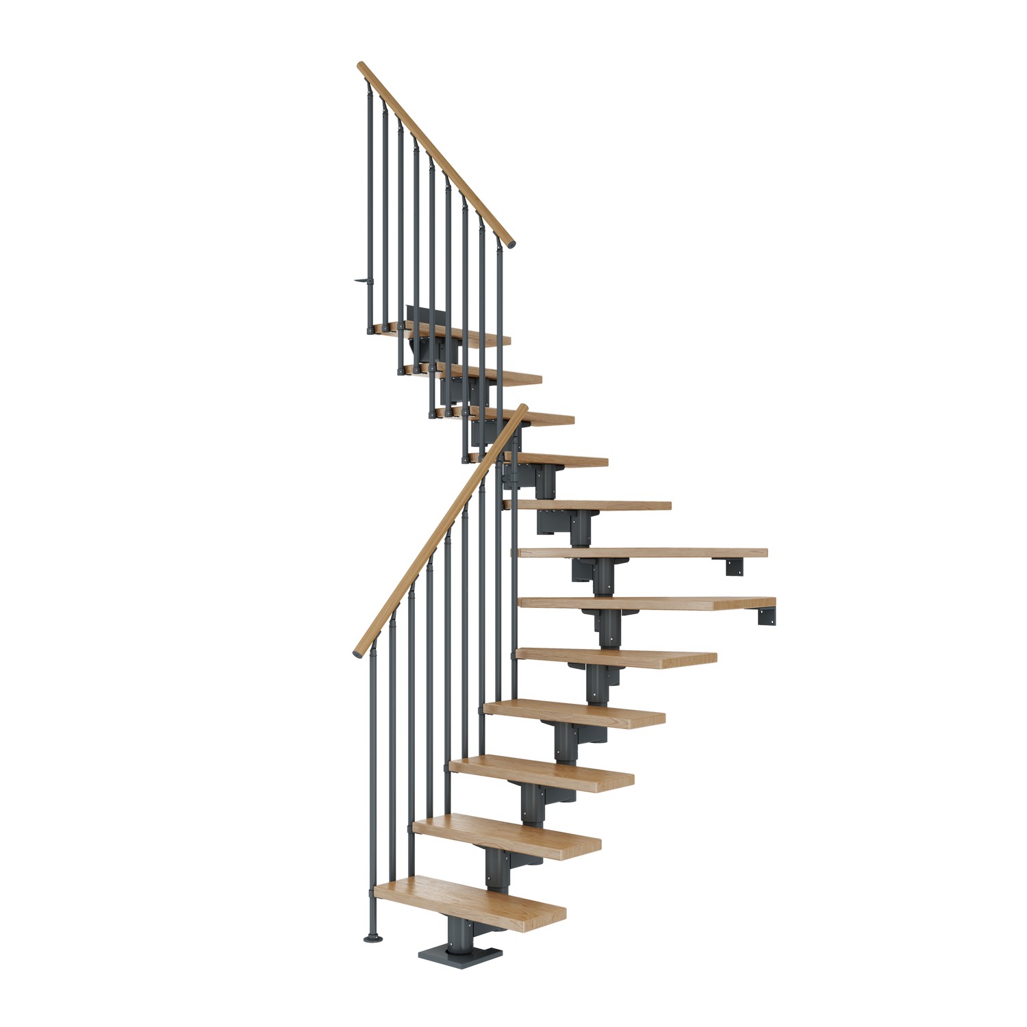 Balustrarna är monterade på utsidan och fästs i två steg för att maximera komfort och stabilitet. Detta gör även trappstegen lättare att rengöra. Balustrarnas övre del är gjord av pulverlackerat aluminium som ger en förstklassig finish. Räckena är pulverlackerade i samma moderna halvblanka färg som trappans strukturella element. Handledaren är gjort av samma massiva trä som trappstegen. Enkel och elegant!