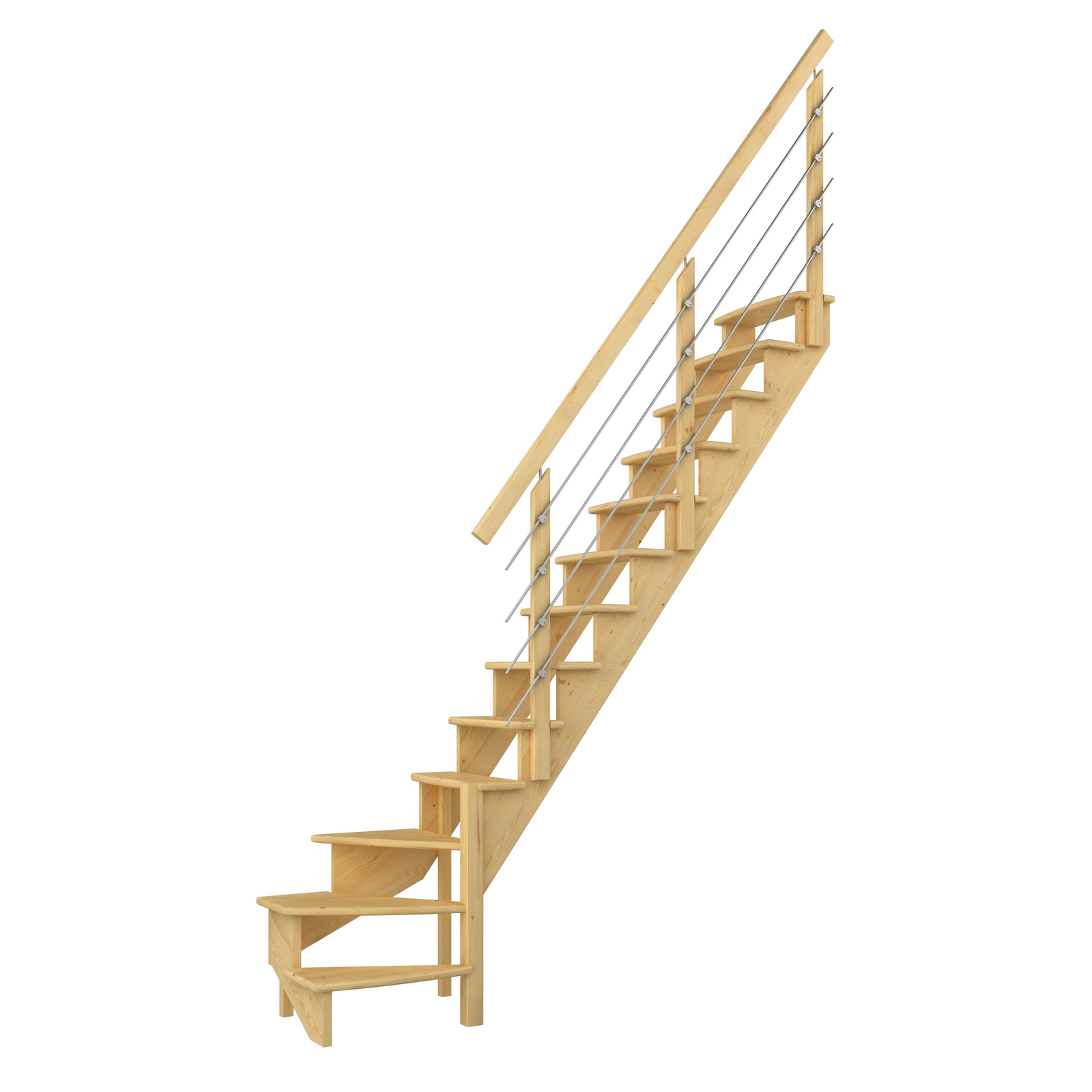 Lyon är en platsbesparande trappa från Dolle med horisontellt stålräcke. Trappan är tillverkad i massivt trä med 21 cm djupa och lätt rundade steg som ger en bekväm yta att gå på.