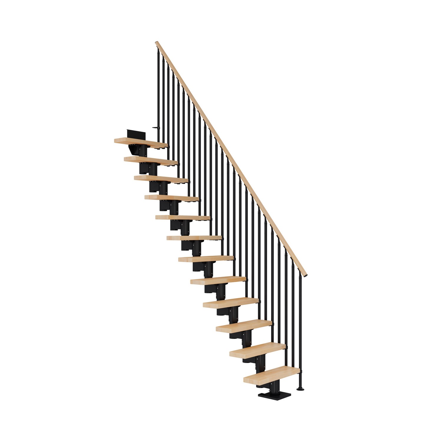 11-15 massiva trästeg ingår som ger en maximal golv-till-golvhöjd på 360 cm. Vid 13-15 steg är det nödvändigt att installera stödstolparna som ingår i paketet. Om golv-till-golvhöjden inte är nödvändig avlägsnas steg helt enkelt tills önskad höjd nås. Trappans ytor är otroligt slitstarka, tål repor och är lätta att underhålla tack vare den halvblanka ytan. Höjden på varje steg kan justeras mellan 18,5 och 22,5 cm.