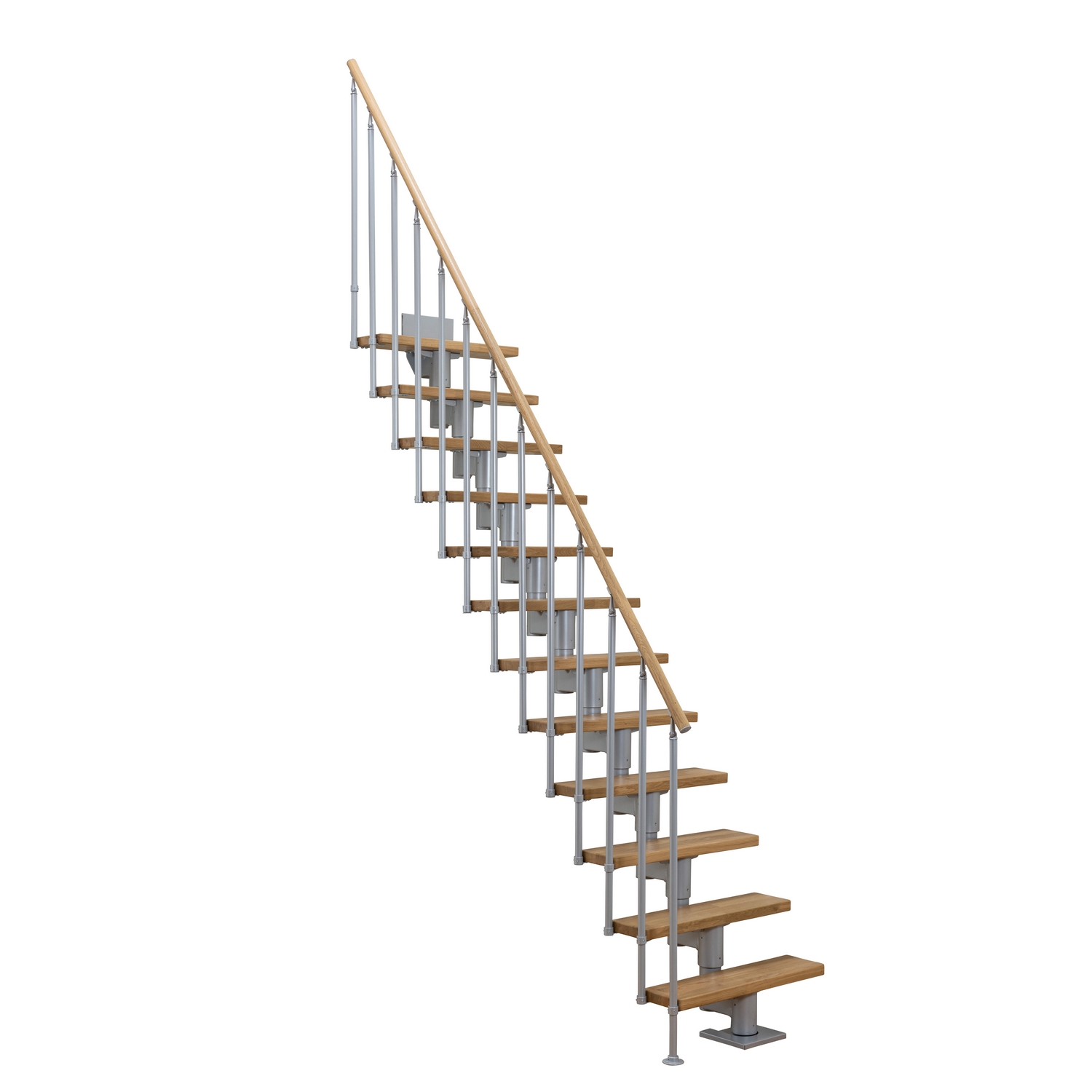 11-15 massiva trästeg ingår som ger en maximal golv-till-golvhöjd på 360 cm. Vid 13-15 steg är det nödvändigt att installera stödstolparna som ingår i paketet. Om golv-till-golvhöjden inte är nödvändig avlägsnas steg helt enkelt tills önskad höjd nås. Trappans ytor är otroligt slitstarka, tål repor och är lätta att underhålla tack vare den halvblanka ytan. Höjden på varje steg kan justeras mellan 18,5 och 22,5 cm.