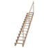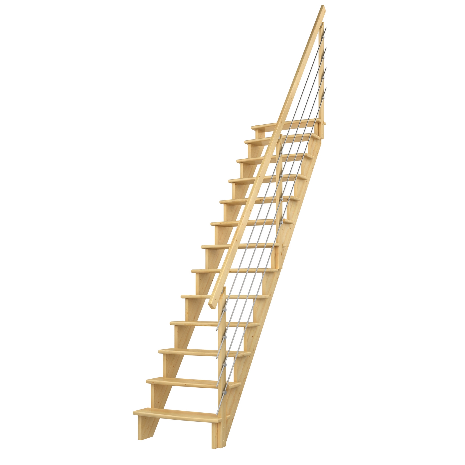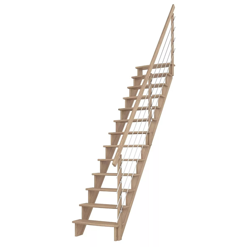 Lyon är en platsbesparande trappa från Dolle med horisontellt stålräcke. Trappan är tillverkad i massivt trä med 21 cm djupa och lätt rundade steg som ger en bekväm yta att gå på.