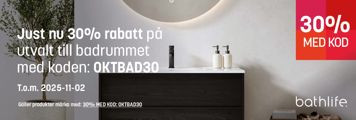 Det stora sortimentet av kakel, mosaik och klinkers ger oändliga möjligheter att skapa ramen till ett äkta drömbadrum. Numera är även trä ett alternativ för den som söker ett vackert och levande material. Här finns inga begränsningar. Oavsett vilken färg eller stil du är ute efter till ditt badrum har vi ett stort sortiment med allt för svart badrum och vitt badrum. Välj efter behag en ångande duschkabin med en mängd funktioner och/eller ett badkar i valfri stil, alltifrån modernaste bubbelbadkar till klenoder med lejontassar.