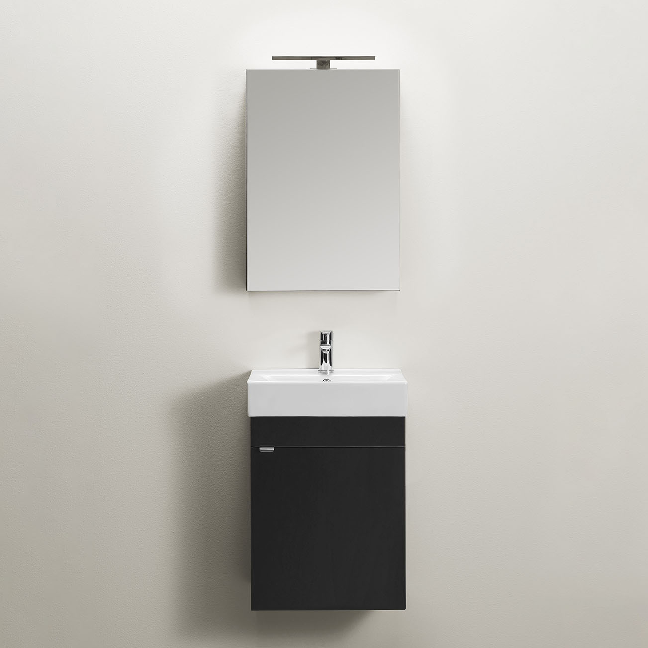 Tvättställsskåp med mjukstängande lucka som ger generös förvaring. Inklusive nedsänkt handfat och spegelskåp med dubbelsidiga spegeldörrar i sammetsmatt färg. Tvättställsskåpet är enkelt att installera för en person med skena på vägg.