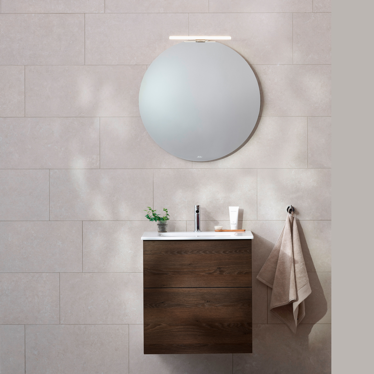Möbelpaket från Miller Badrum med kommod, tvättställ och rund spegel med toppbelysning. I möbelpaketet ingår en New York lådkommod med rejäla, fullt utdragbara lådor och eluttag i nedersta lådan. Övre kommodlåda har löstagbart inrede av ek. Tvättställ Bloc i vitt porslin med hög kant. Rund spegel 70 cm med LED toppbelysning som dimras via touch-sensor inbyggd i armaturen och kopplas till väggbrytare.