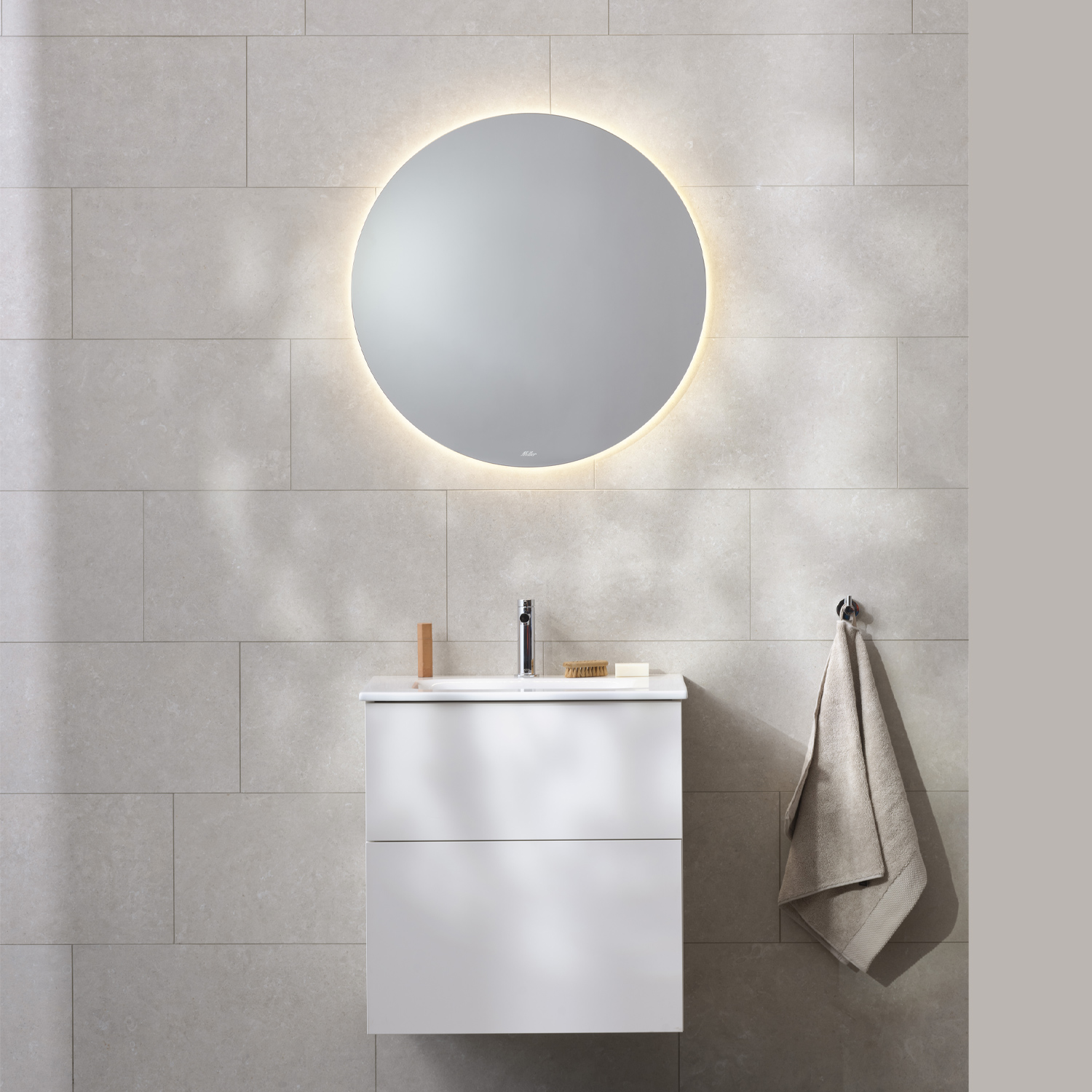 Möbelpaket från Miller Badrum med kommod, tvättställ och rund spegel med dimbart indirekt ljus.