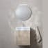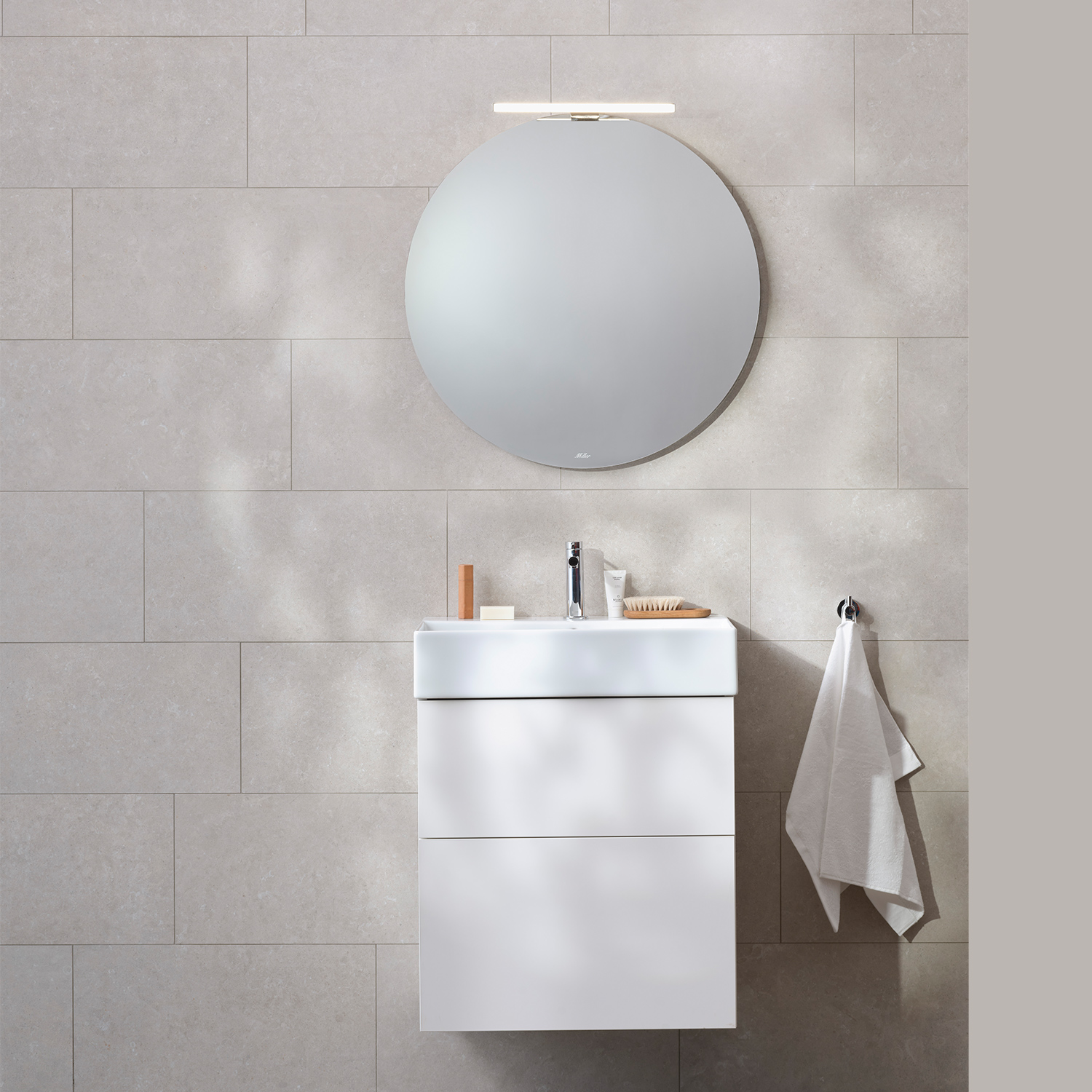 Möbelpaket från Miller Badrum med kommod, tvättställ och rund spegel med toppbelysning.