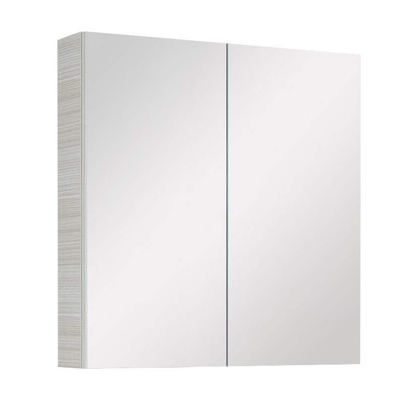 Hyllplanen i glas är flyttbara och skåpet har ett eluttag inuti. Dörrarna är mjukstängande och har speglar på båda sidor. Levereras färdigmonterat.