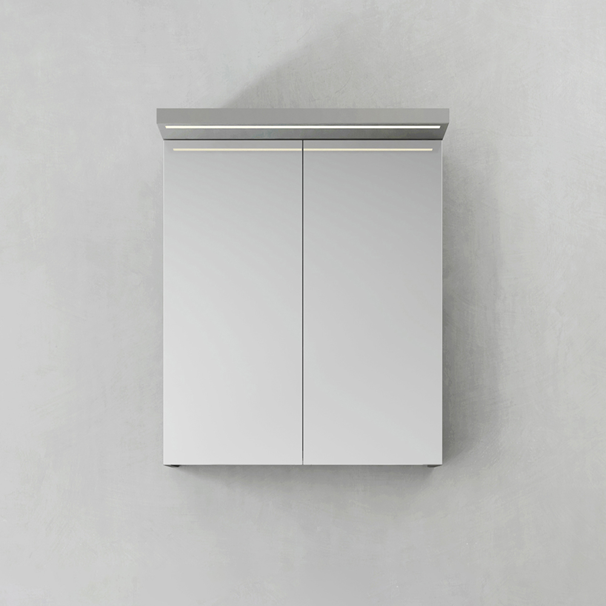 Spegelskåp med funktionell belysning med infälld LED-profil eller LED-spots i varmvitt ljus.