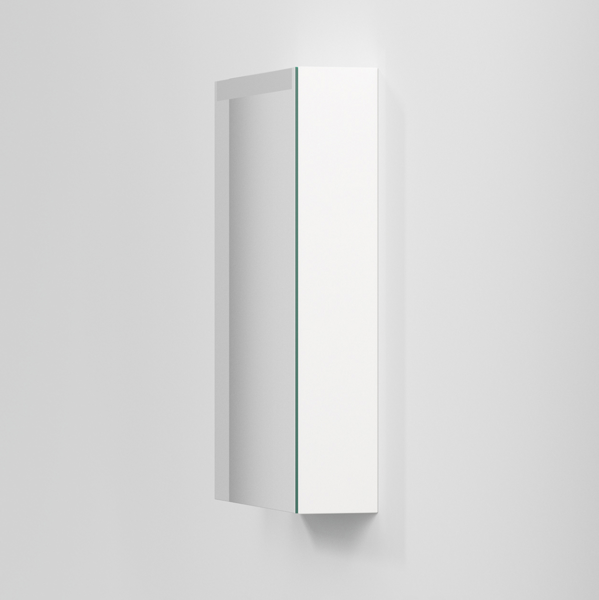 Spegelskåpet kopplas till rummets strömbrytare och belysningen har därför ingen av-/på-knapp. Komlettera med förstoringsspegel som monteras på insidan av skåpet samt underbelysning.