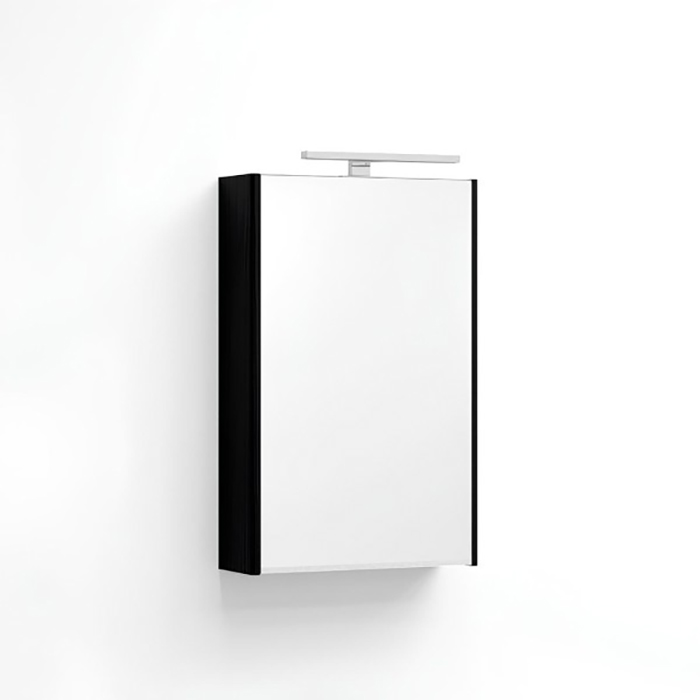 Spegelskåp Macro Design Heart har en ram i vit eller svart askfanér som följer seriens mjuka former. Skåpen finns i flera bredder och utföranden.