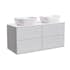 Tvättställsskåp Alterna Gabriella med bänkskiva och två rektangulära ovanpåliggande tvättställ. Bänkskivan är gjord av kvartskomposit och tvättställen i porslin, 415x415x135 mm. Underskåpen har mjukstängande lådor. Handtag och blandare beställs separat.