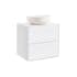 Tvättställsskåp Alterna Gabriella med bänkskiva och runt ovanpåliggande tvättställ. Bänkskivan är gjord av kvartskomposit och tvättställ i porslin, 415x415x135 mm. Underskåpen har mjukstängande lådor som ger en lyxig och tyst användning samtidigt som de ökar möbelns livslängd.