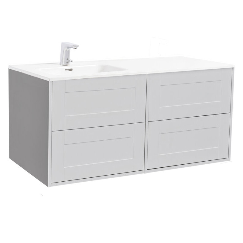 Tvättställsskåp Alterna Gabriella levereras med Ariella tvättställ i porslin. Underskåpen har mjukstängande lådor. Möblerna är mer tåliga mot fukt då de tillverkas i en fukttrög MDF. Underskåpen levereras färdigmonterade. Du kan välja om du vill ha din ho placerad åt vänster eller höger.