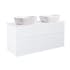 Tvättställsskåp Alterna Isella levereras med bänkskiva och ovanpåliggande tvättställ. Bänkskivan är gjord av kvartskomposit och dubbla tvättställ i porslin, 455x325x135 mm. Underskåpen har mjukstängande lådor. Handtag och blandare beställs separat.