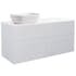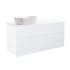 Tvättställsskåp Alterna Isella levereras med bänkskiva och ovanpåliggande tvättställ. Bänkskivan är gjord av kvartskomposit och tvättställ i porslin, 455x325x135 mm. Underskåpen har mjukstängande lådor. Handtag beställes separat.