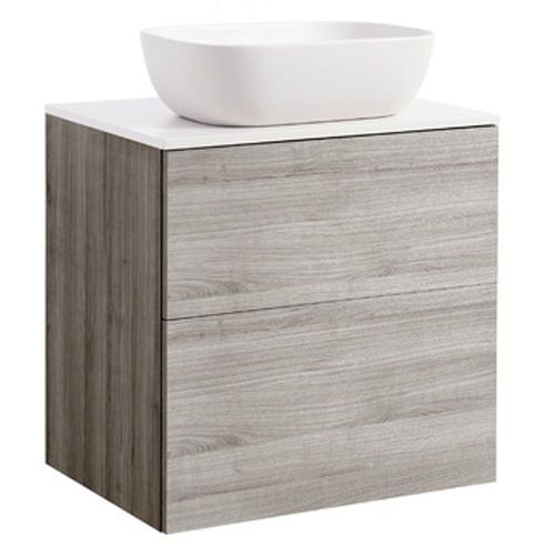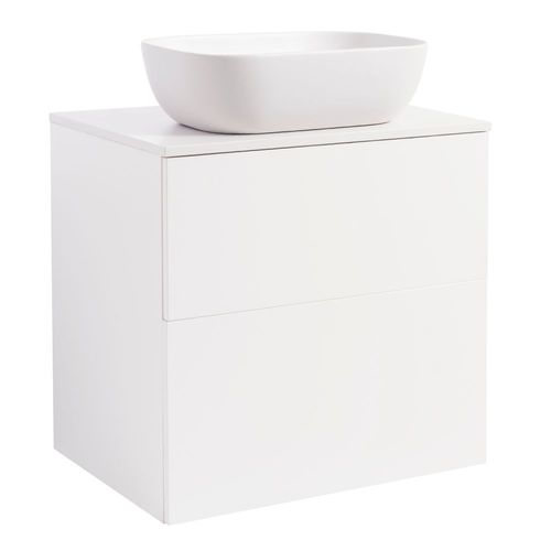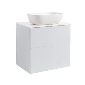 Tvättställsskåp Alterna Isella levereras komplett med bänkskiva och ovanpåliggande tvättställ. Bänkskivan är gjord av kvartskomposit och tvättställ i porslin, 455x325x135 mm. Underskåpen har mjukstängande lådor. Handtag och blandare beställs separat.