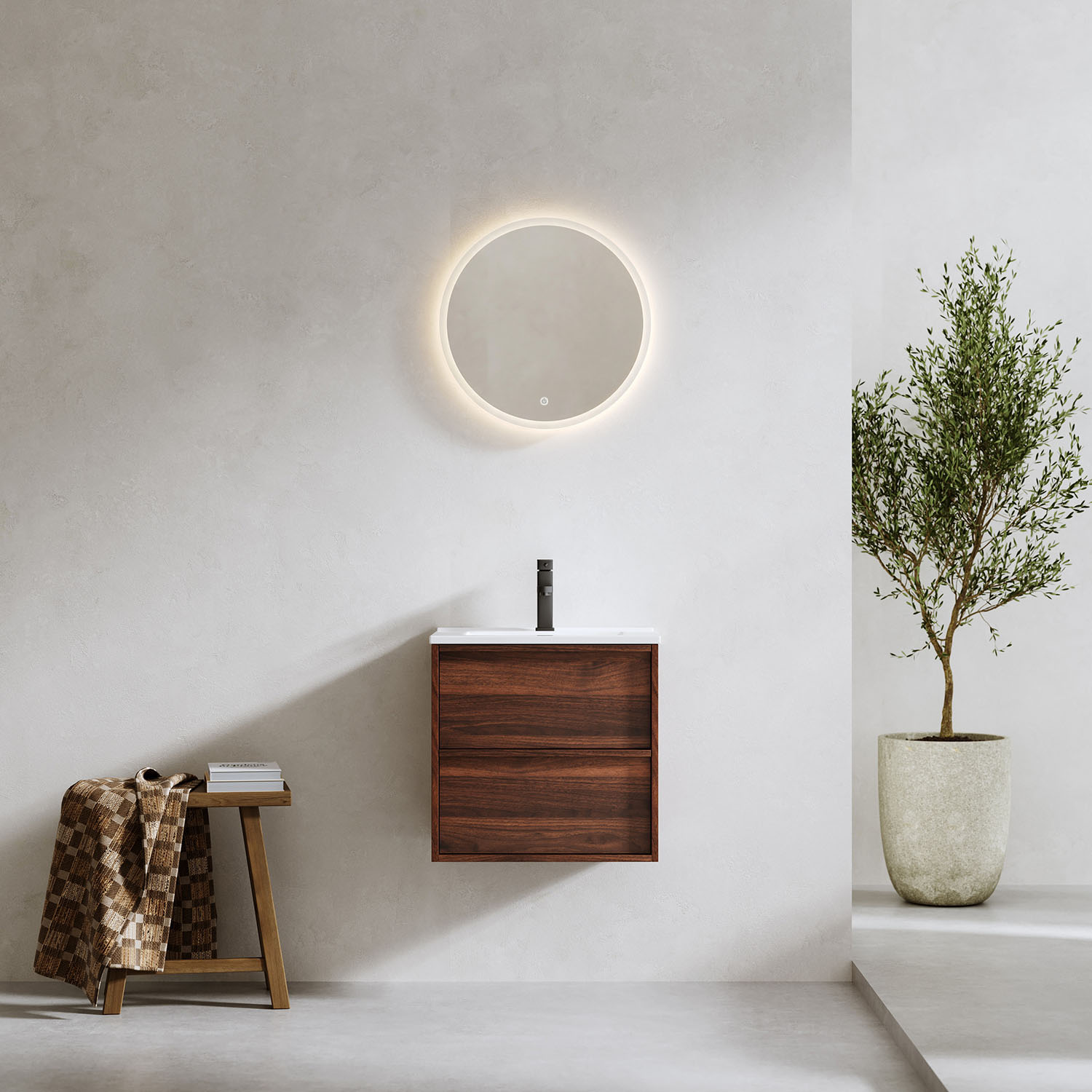 Möbeln levereras färdigmonterad inklusive porslinstvättställ och en kromad bottenventil. Komplettera med bottenventil, tvättställsblandare och avloppssats.