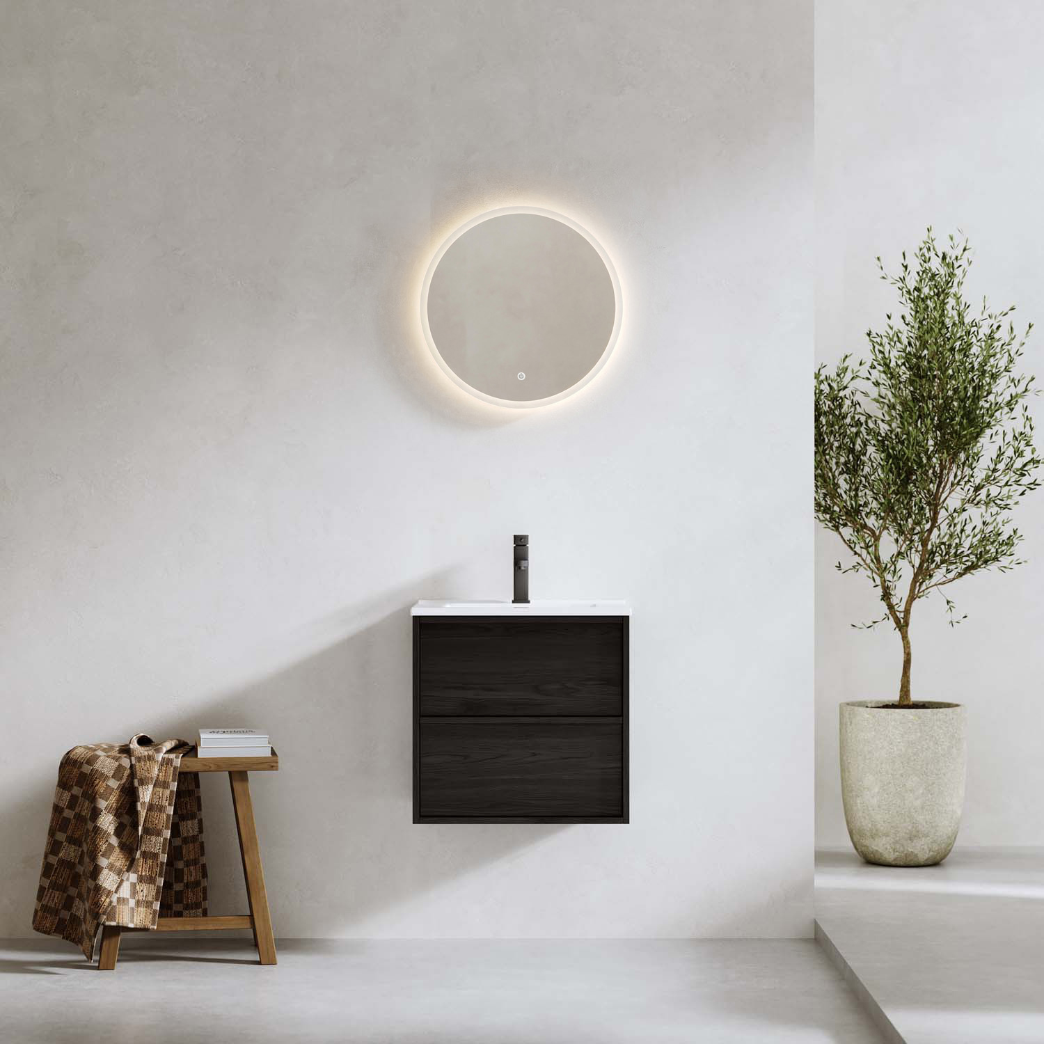 Tvättställsskåp Bathlife Charm med tvättställ är en modern och elegant kommod med fina detaljer som tunn ram runtom, integrerade grepplister på de mjukstängande lådorna och vackert trämönstrad yta. Skåpet är tillverkat av melaminbelagd MDF och det medföljande tvättstället är av vitt porslin. Skåpet ger bra med förvaring i de två lådorna som är mjukstängande.
