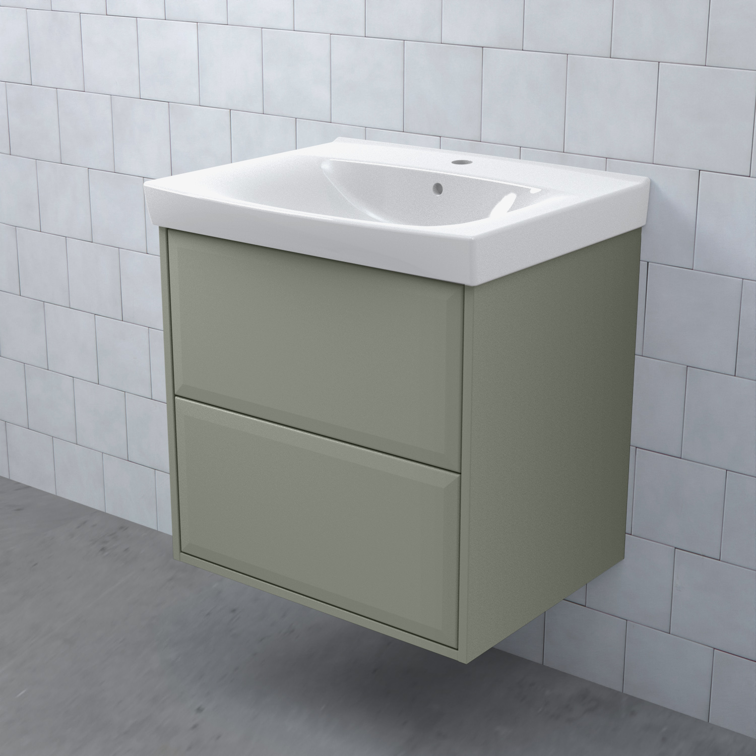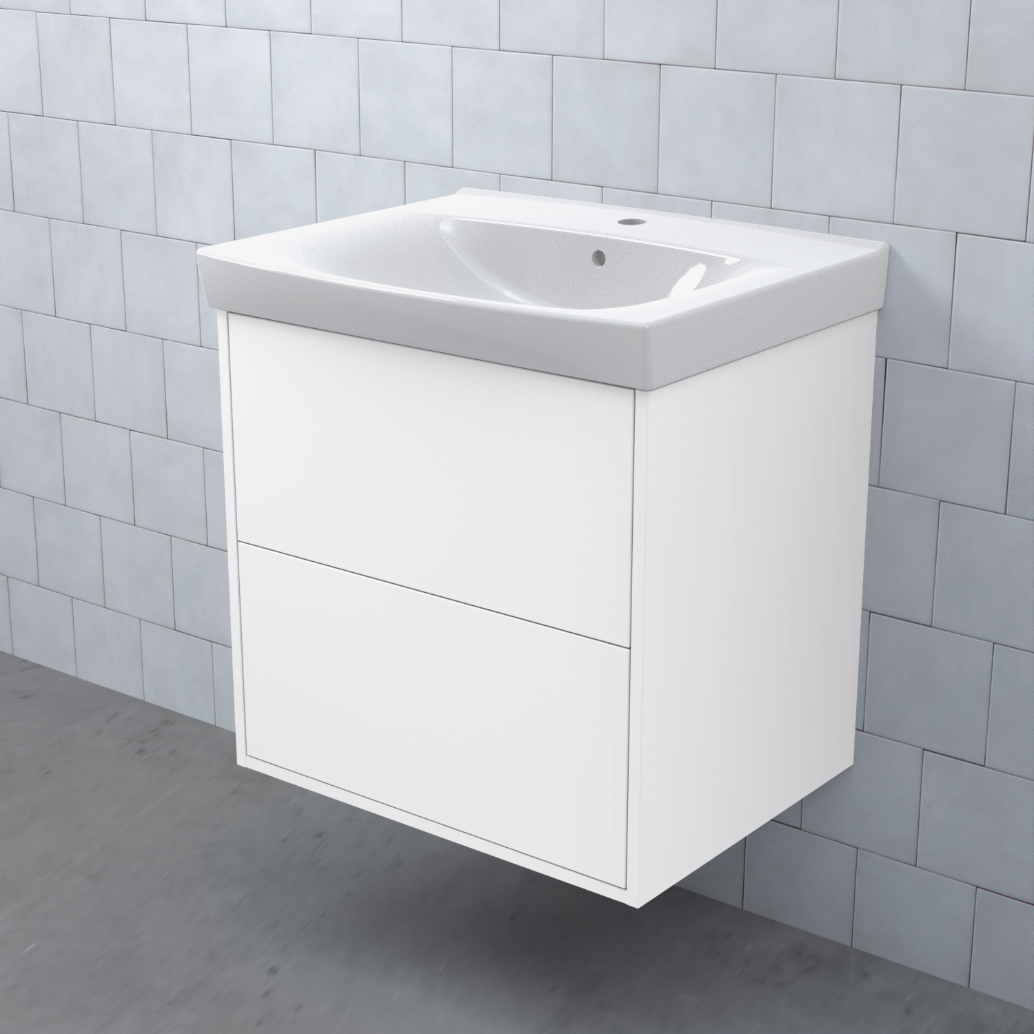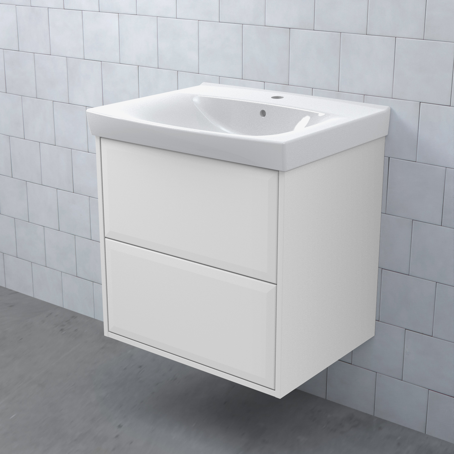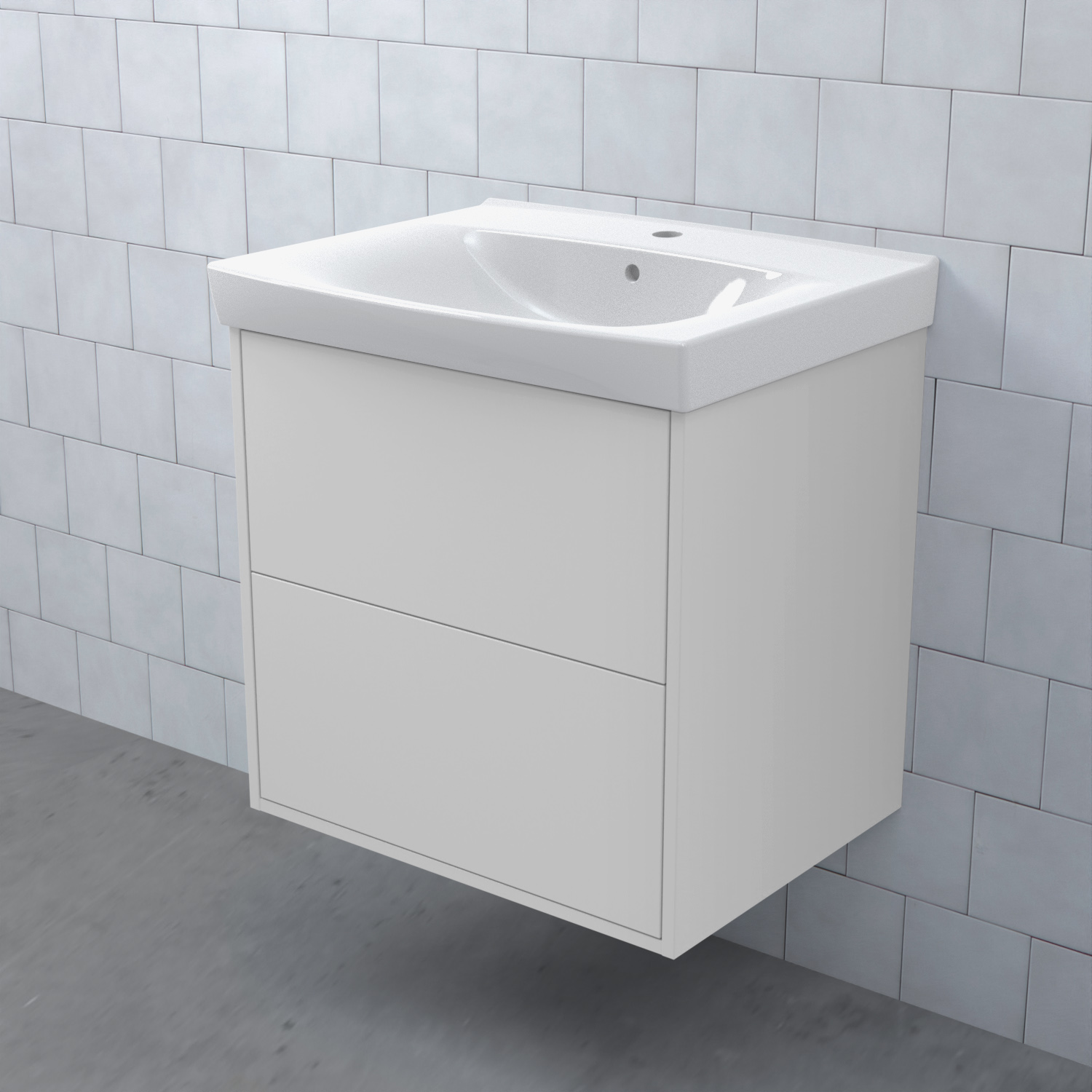 Stommen är tillverkad av fukttrögt skivmaterial och skåpet levereras färdigmonterat och transportförpackat från fabrik. Komplettera din möbel med tvättställ, blandare, handtag, eluttag, extra lådindelare och ben. Du kan välja mellan olika heltäckande tvättställ, ovanpåliggande tvättställ med medföljande bänkskiva eller en bänkskiva med ett underlimmat porslinstvättställ, allt efter eget tycke och smak.