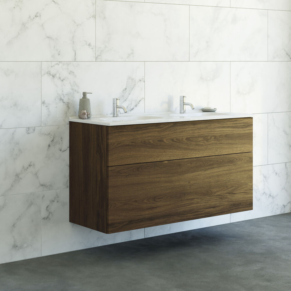 Det dubbla tvättstället i sanitetsporslin har två separata bassänger som gör det enkelt att dela utrymme och den lättrengjorda ytan förblir vacker över tid. Tvättställsskåpet har två rymliga lådor, där den nedersta lådan har extra höjd - perfekt för förvaring av större flaskor och rengöringsmedel. Med en konsekvent dansk design och fokus på kvalitet är det här en elegant lösning för badrummet.