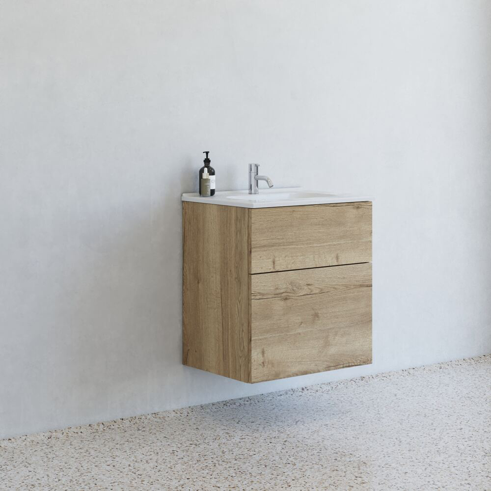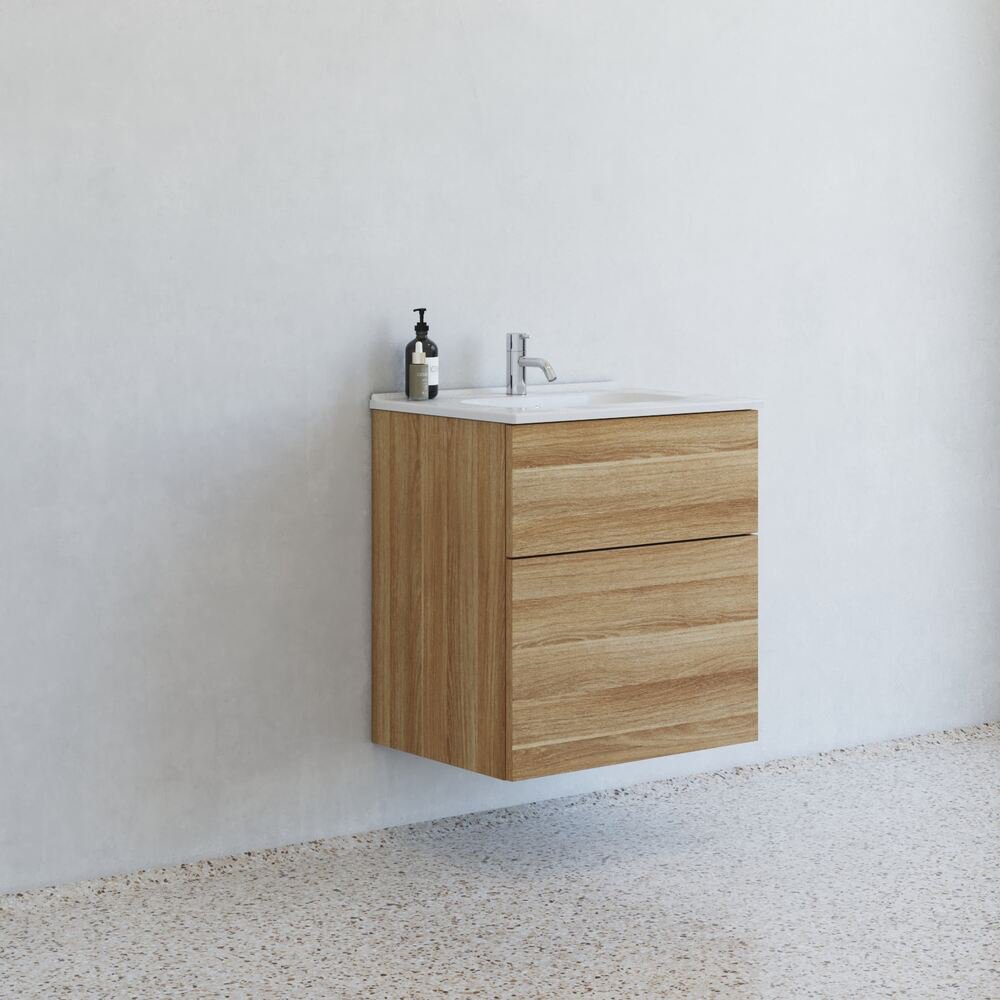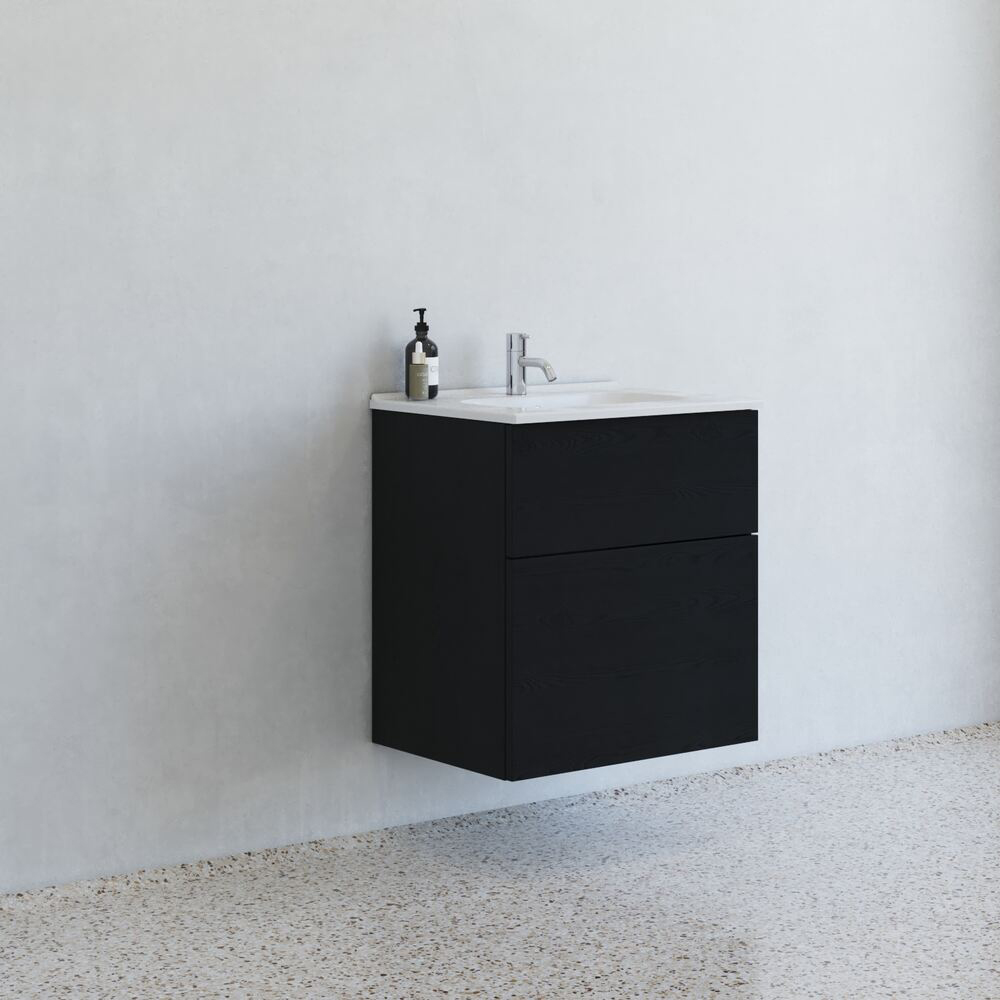 Tvättstället är tillverkat av slitstarkt sanitetsporslin med en mjuk oval skål och en blank, lättrengjord yta som kräver minimalt underhåll. Tvättställsskåpet har en rymlig bottenlåda, perfekt för förvaring av allt från schampo till rengöringsmedel. Lådorna är helt utdragbara, självstängande och dämpade för att stängas tyst och elegant. En lösning som kombinerar stil, kvalitet och funktionalitet.