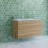 Tillsammans med skåpet ingår det dubbla tvättstället Minore i solid surface, ett modernt och slitstarkt material som är ett stilrent alternativ till porslin och marmor. Solid surface möjliggör ett lätt och luftigt uttryck med raka vinklar och mjuka, minimala rundningar. Tvättstället har en tunn, vit och matt yta som ger en ren och sofistikerad känsla.