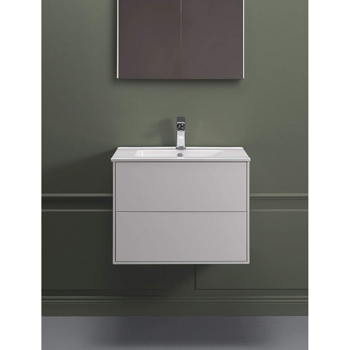 Komplettera ditt tvättställsskåp med ett fristående tvättställ och bänkskiva eller ett inbyggt tvättställ, ett PUM-vattenlås och en tvättställsblandare. Lådbelysning, eluttag och handtag finns som tillbehör.
