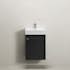 Tvättställsskåp i sammetsmatt lack i svart eller vitt med mjukstängande lucka som ger generös förvaring inklusive nedsänkt handfat. Tvättställsskåpet är enkelt att installera för en person med skena på vägg.