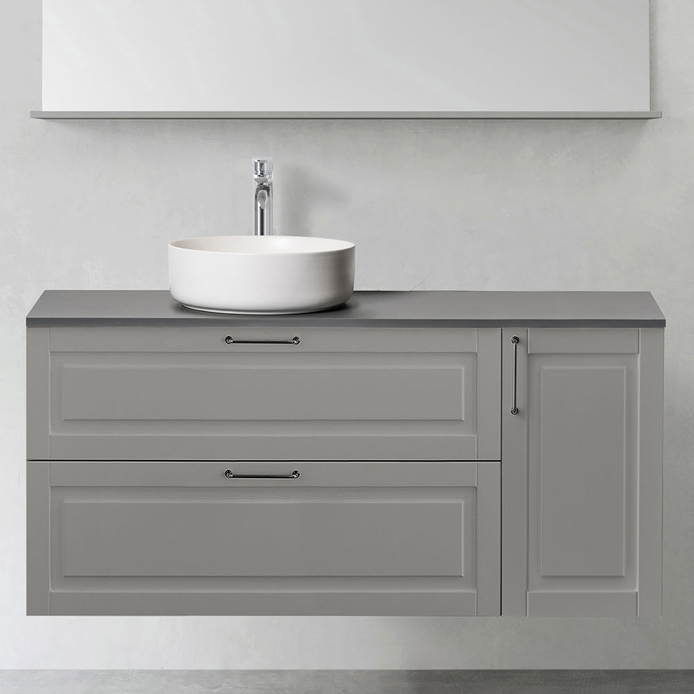 Välj handtag eller knopp som passar din stil och komplettera med fristående handfat på en bänkskiva eller nedsänkt tvättställ i porslin. Köp till blandare, bottenventil, vattenlås, lådbelysning och eluttag.