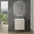Kommoderna i serien finns i två bredder, 60 cm och 80 cm, vilket ger flexibilitet för olika badrumsstorlekar. Med ett djup på 46 cm och en höjd på 59 cm erbjuder de tillräckligt med förvaringsutrymme utan att dominera rummet. De är utrustade med två rymliga lådor med mjukstängande mekanismer, vilket gör dem både praktiska och tystgående. Lådornas greppkanter, tillverkade i samma material och finish som resten av möbeln, bidrar till en enhetlig och modern look.