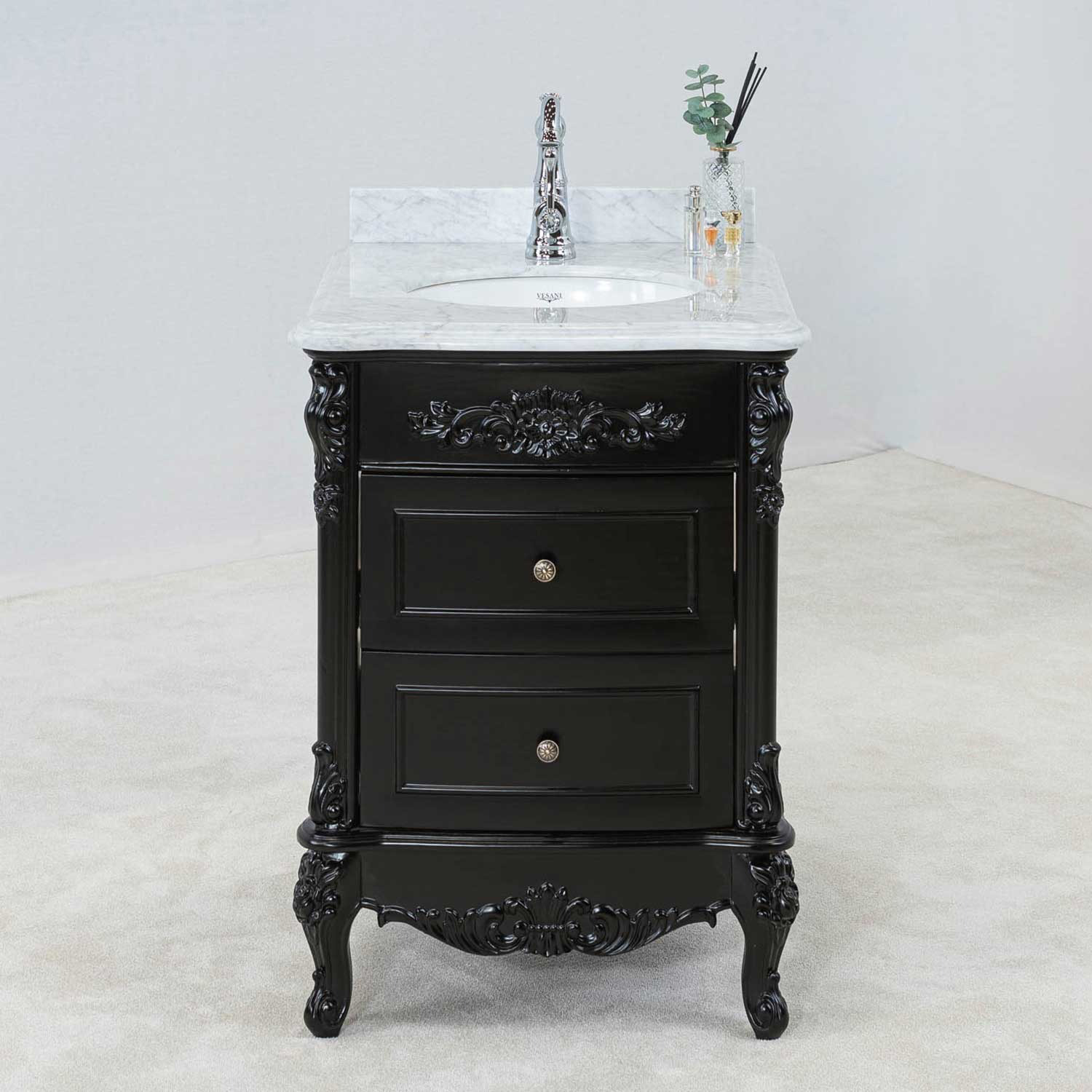 Vesani Ottawa är en badrumsmöbel i klassisk design med mjukt svängda ben och dekorativa ornament. Serien Ottawa hämtar inspiration från klassisk möbeltradition, med eleganta detaljer som allmogeprofil på bänkskivan, och vackra beslag med antik känsla. En badrumsmöbel för dig som söker något utöver det vanliga. Det som ingår är kommod, bänkskiva + handfat samt beslag i antik mässing.