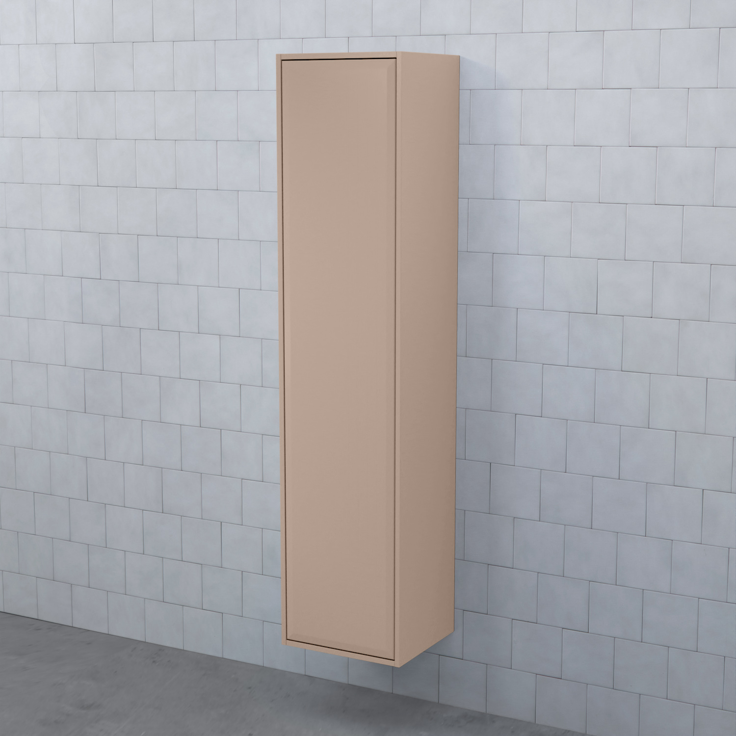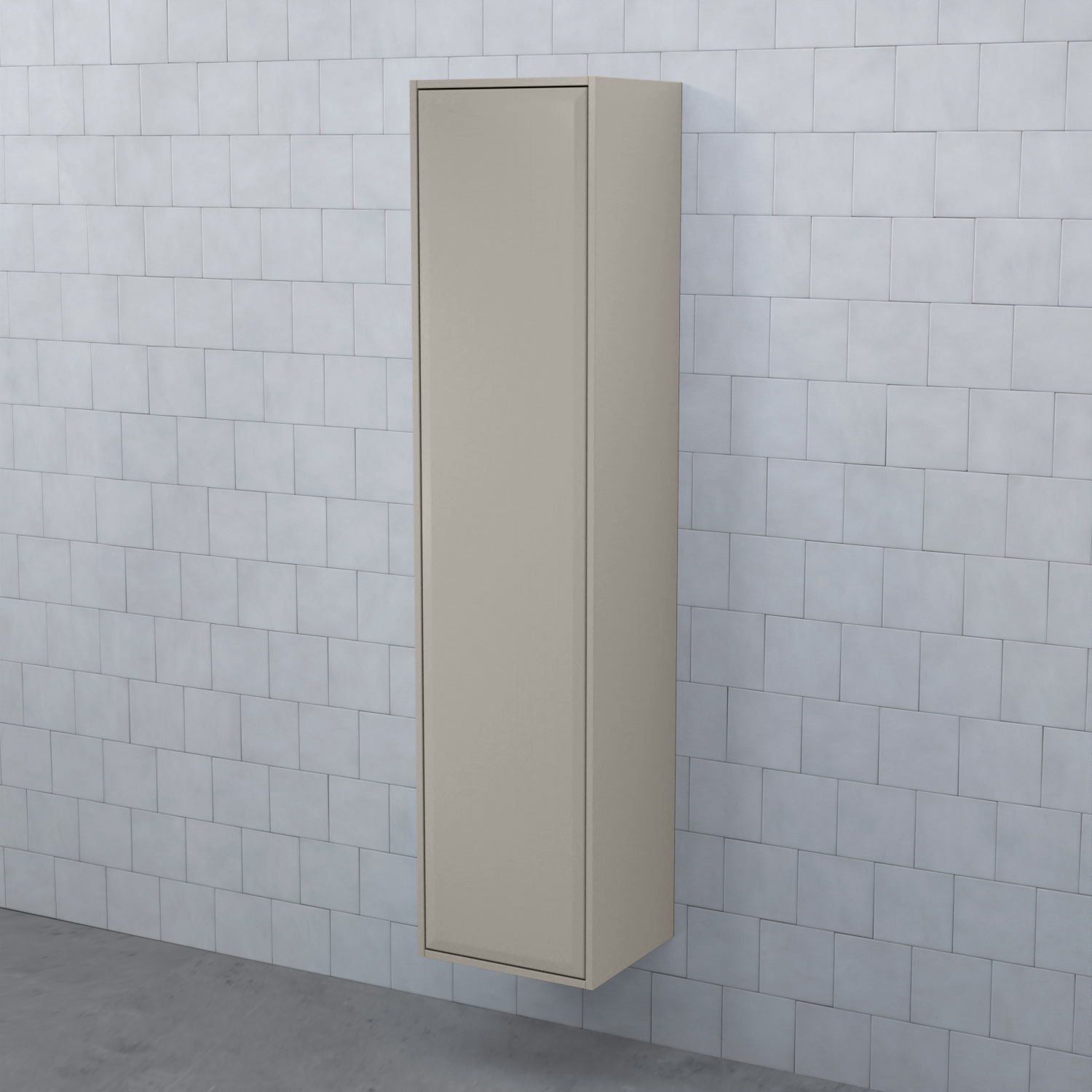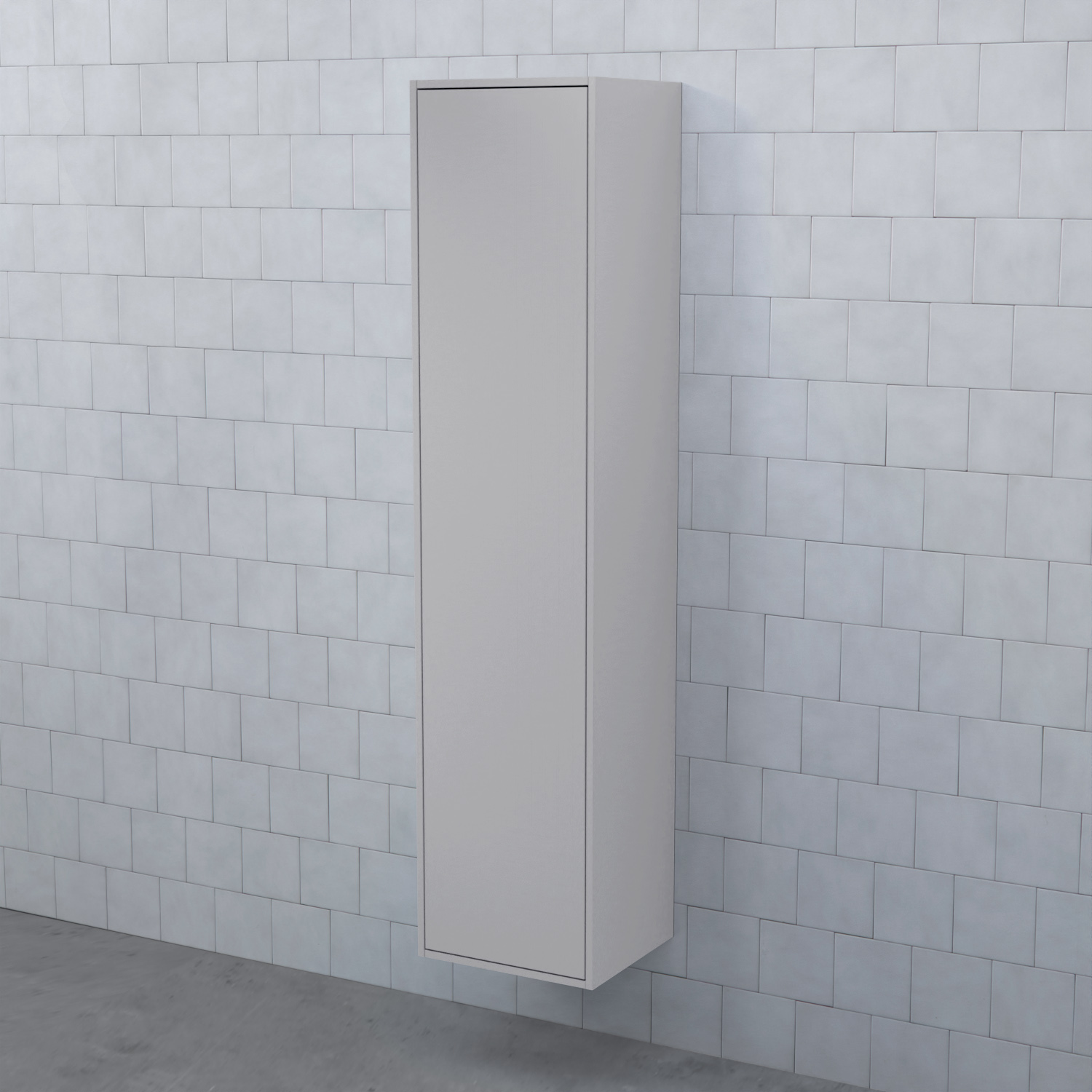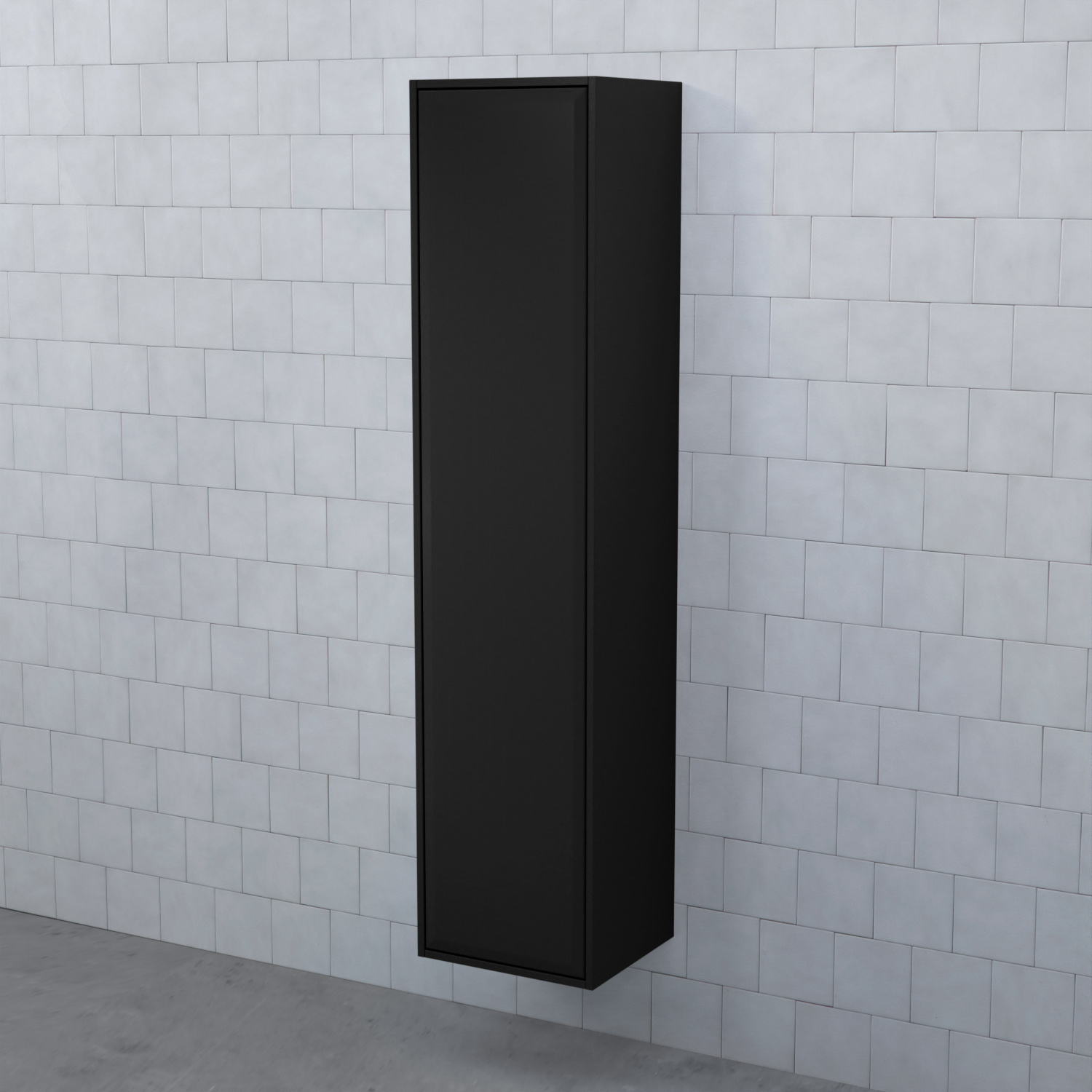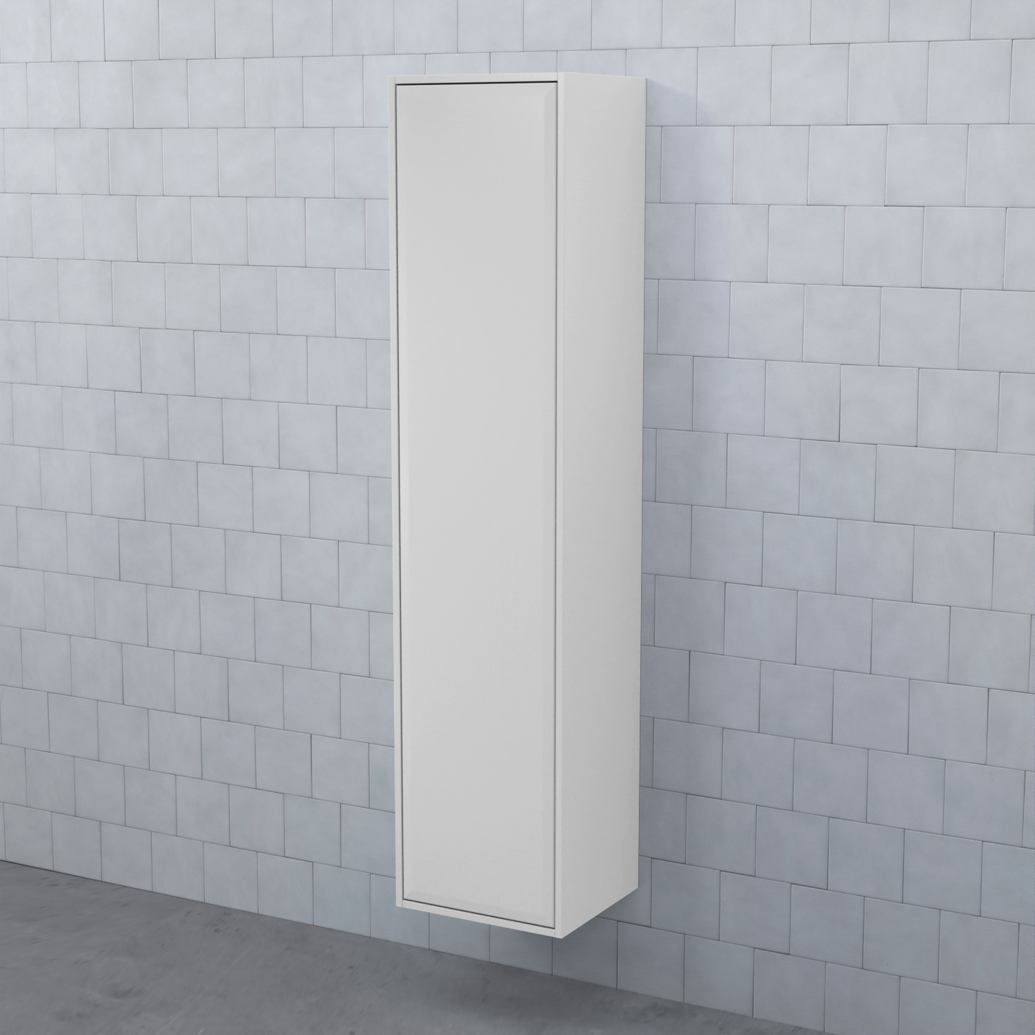Högskåp Björbo Badrum Mejda är ett elegant högskåp tillverkat av målad MDF. Skåpets lucka är självstängande och dämpad. På insidan av luckan finns en praktisk dörrhylla i svartbetsat trä.