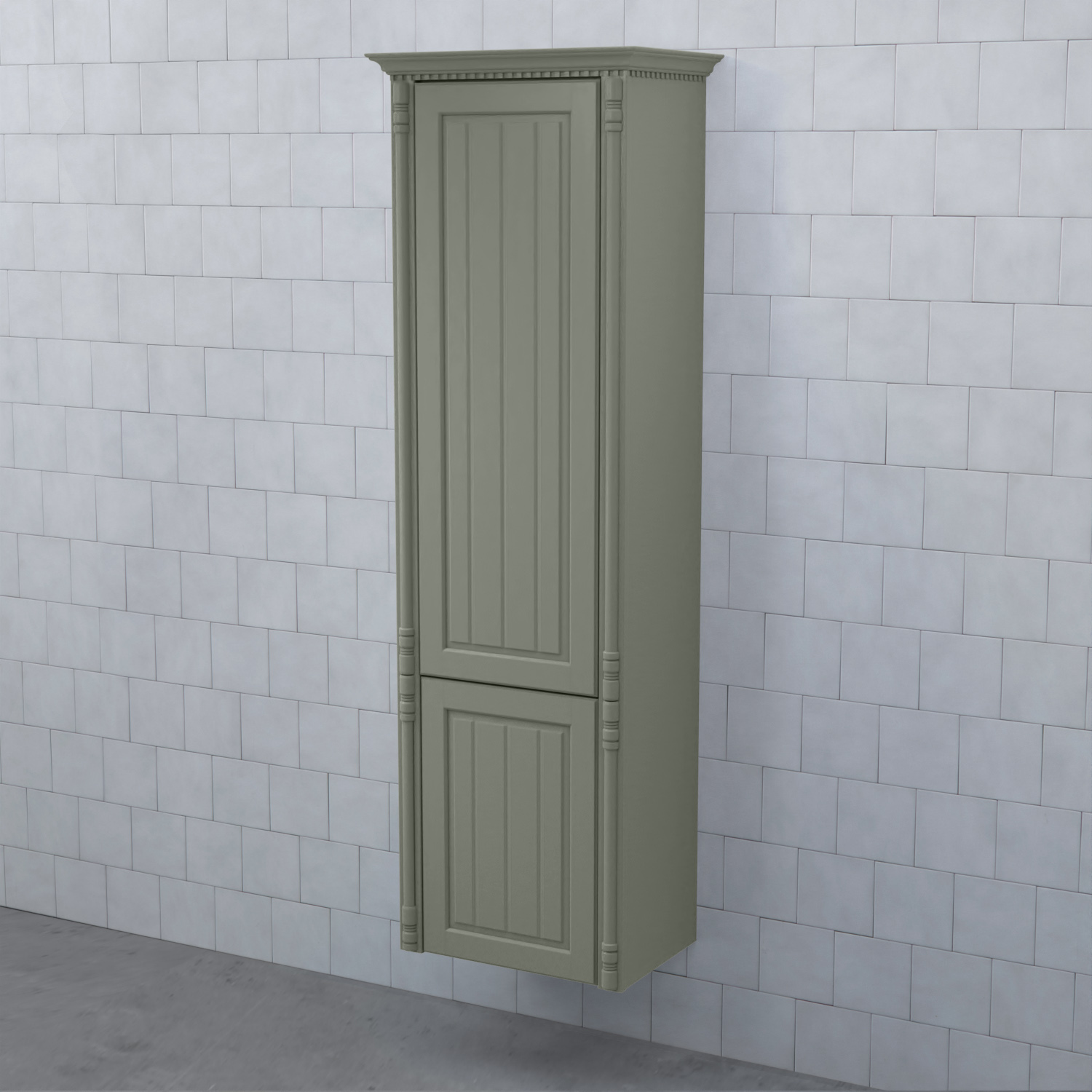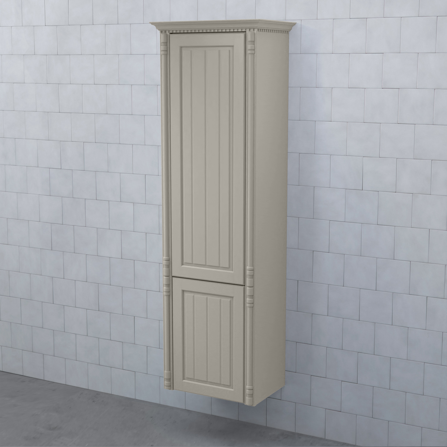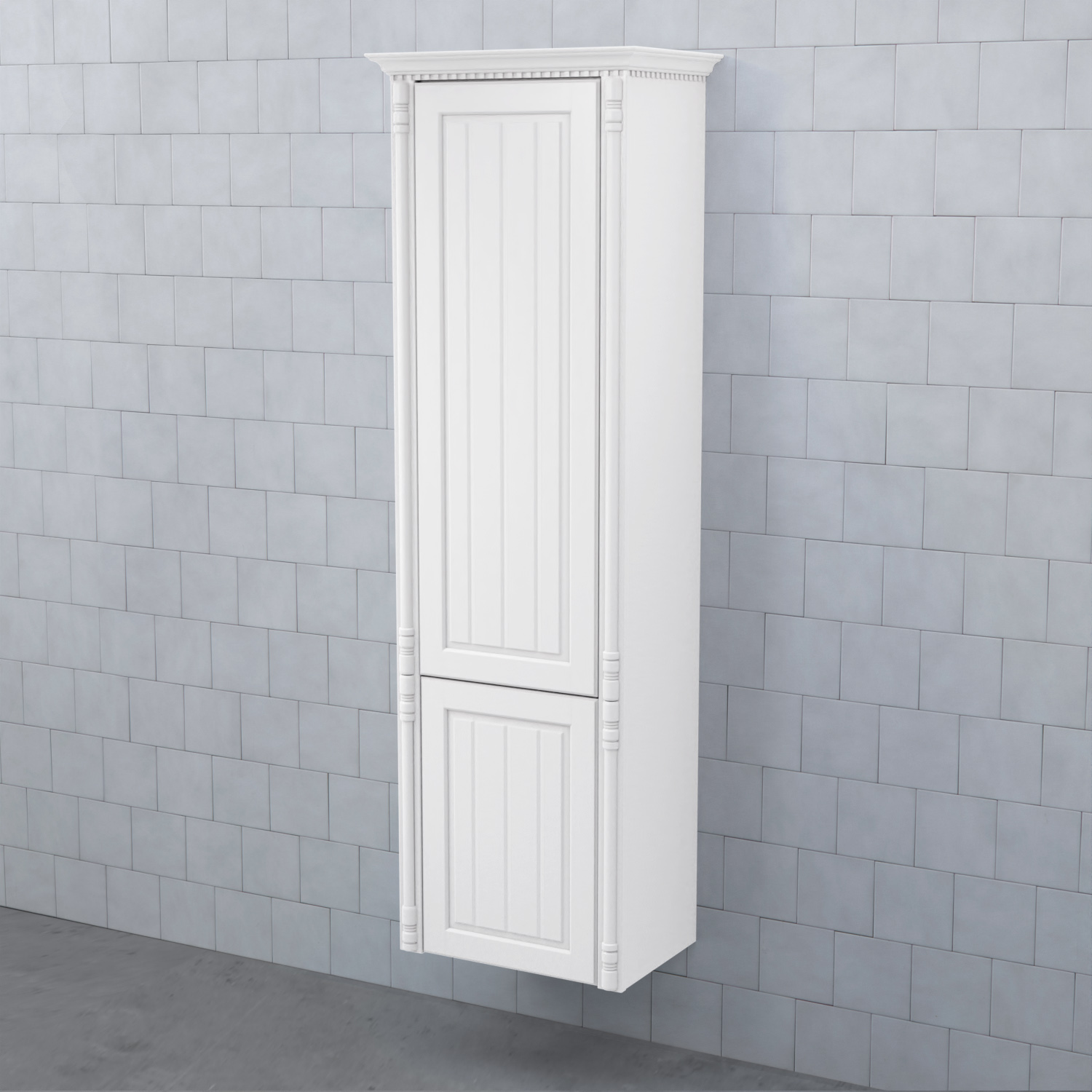 Högskåp Björbo Badrum Valhall med Hög och Låg Lucka är ett elegant badrumsskåp med en tandad krönlist och pelare som stilfullt ramar in möbeln. Stommen är tillverkad av målad MDF med vackra ramluckor med utfrästa spår.