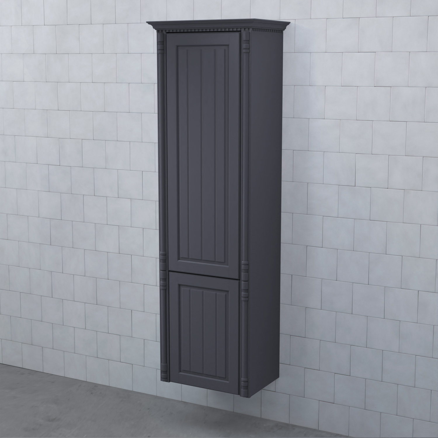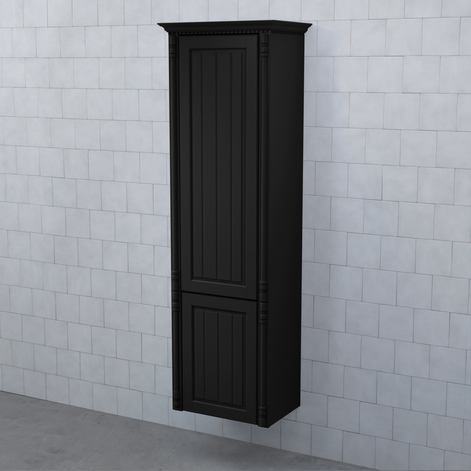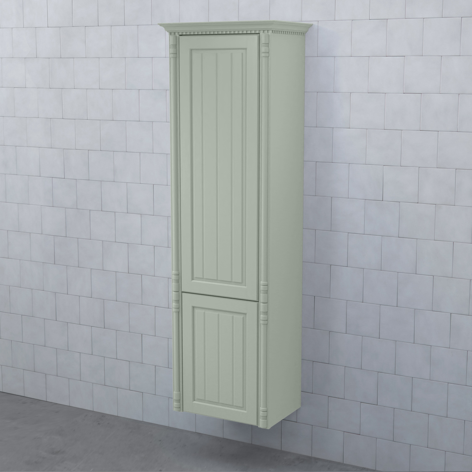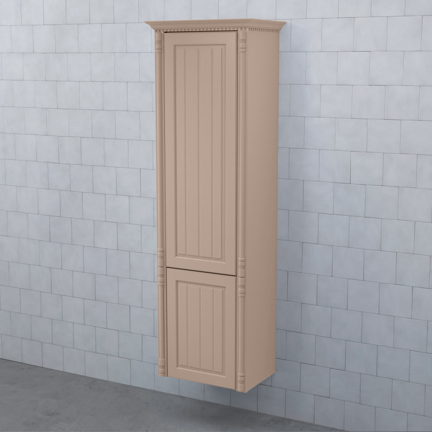 Högskåp Björbo Badrum Valhall med Hög och Låg Lucka är ett elegant badrumsskåp med en tandad krönlist och pelare som stilfullt ramar in möbeln. Stommen är tillverkad av målad MDF med vackra ramluckor med utfrästa spår.