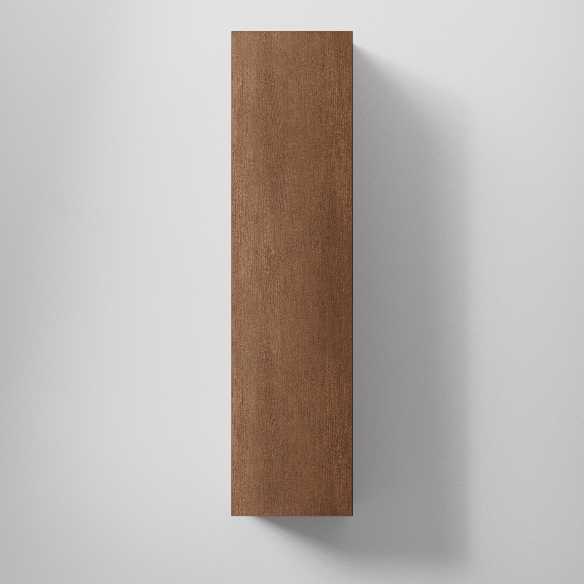 Skåpet har två lådor i matt svartlackerad aluminium, ett fast hyllplan i trä och fyra justerbara hyllplan i 6 mm härdat glas, vilket ger dig både överblick och flexibilitet i din förvaring. Högskåpet finns i flera färger och fanér och har en slät lucka som smidigt matchar INRs olika badrumsmöbler.