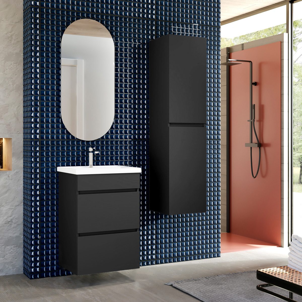 Kommoder och högskåp i serien är utrustade med mjukstängande mekanismer för lådor och dörrar, vilket både ökar användarkomforten och skyddar möblerna från onödigt slitage. Högskåpets dörrar är dessutom vändbara, vilket gör det möjligt att anpassa öppningsriktningen efter ditt badrums layout. Glashyllor i högskåpet ger en elegant och praktisk förvaringslösning, medan den handtagsfria designen skapar ett rent och modernt uttryck.