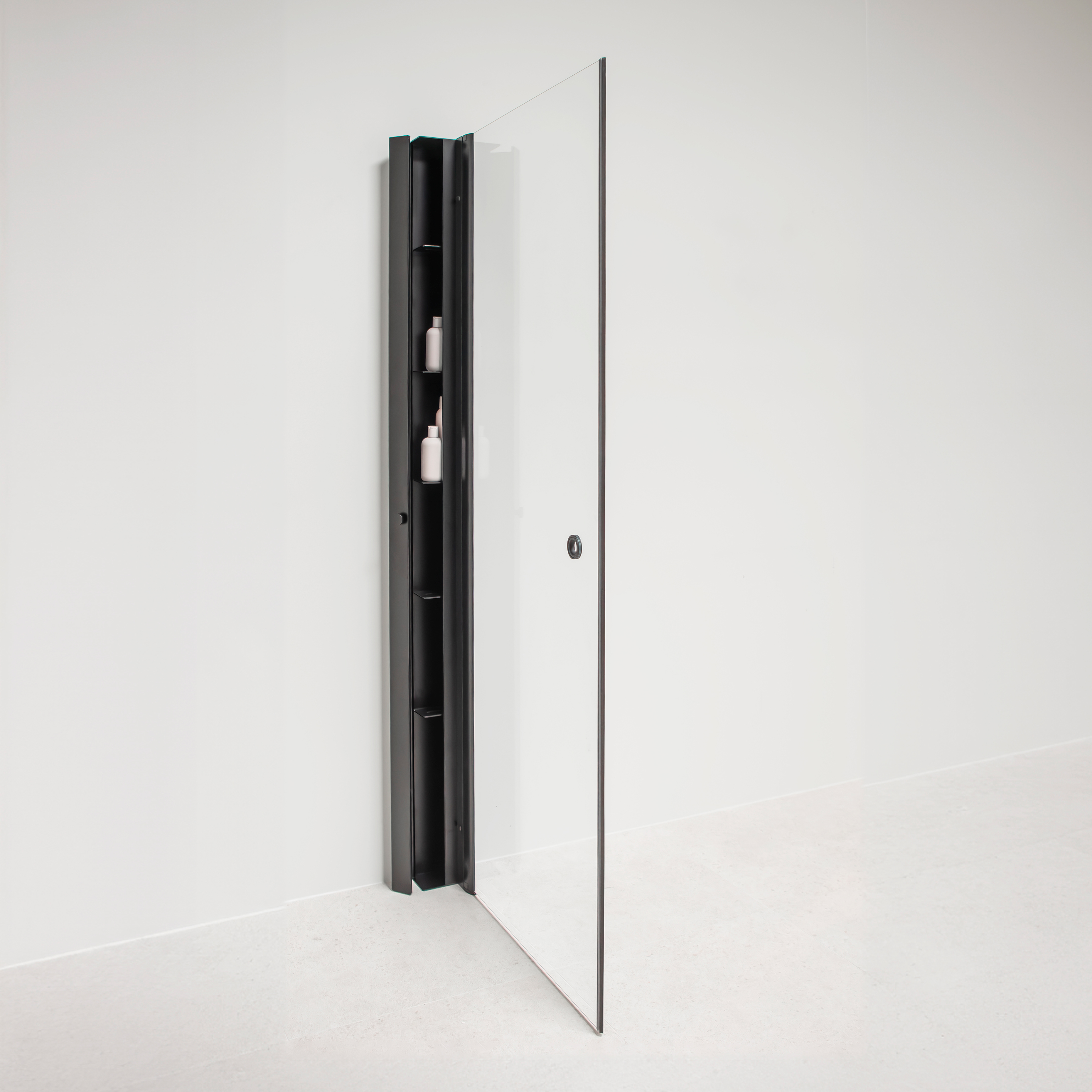 - Duschhylla med dörr, designad för att smälta in och dölja dina duschprodukter