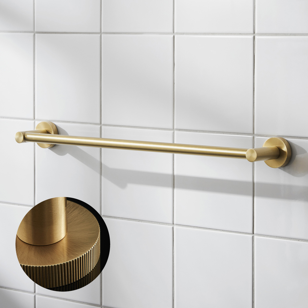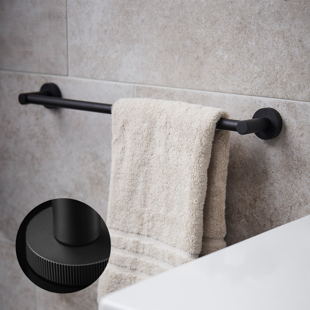 Handduksstång från Miller Badrum. Väggplattans diameter är 45 mm.