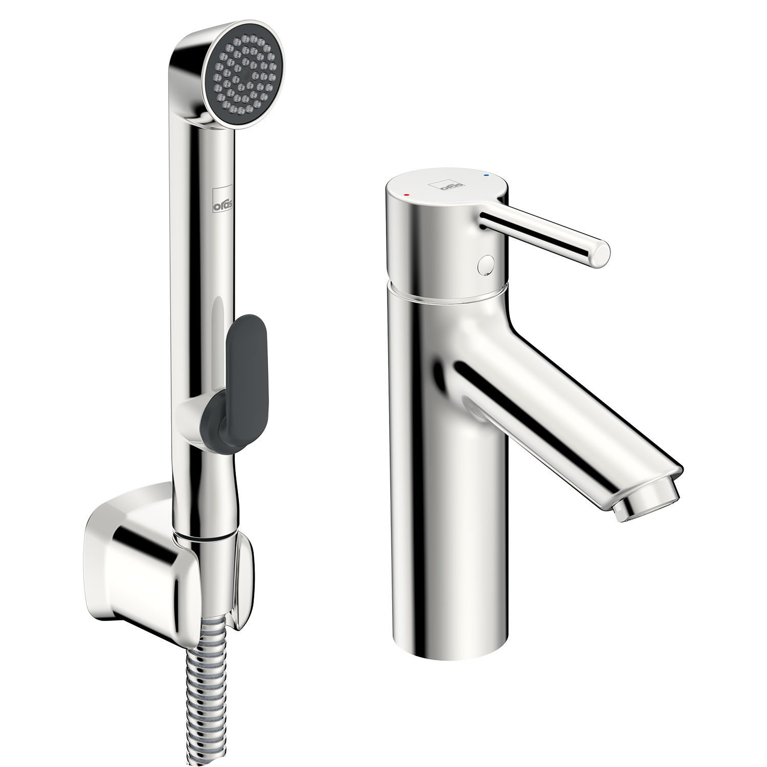 Tvättställsblandare Oras Optima 2606AF med en användarvänlig pinnspak samt självstängande bidetta handdusch, slang och väggfäste. Ettgreppsblandare som passar de flesta tvättställ och miljöer.