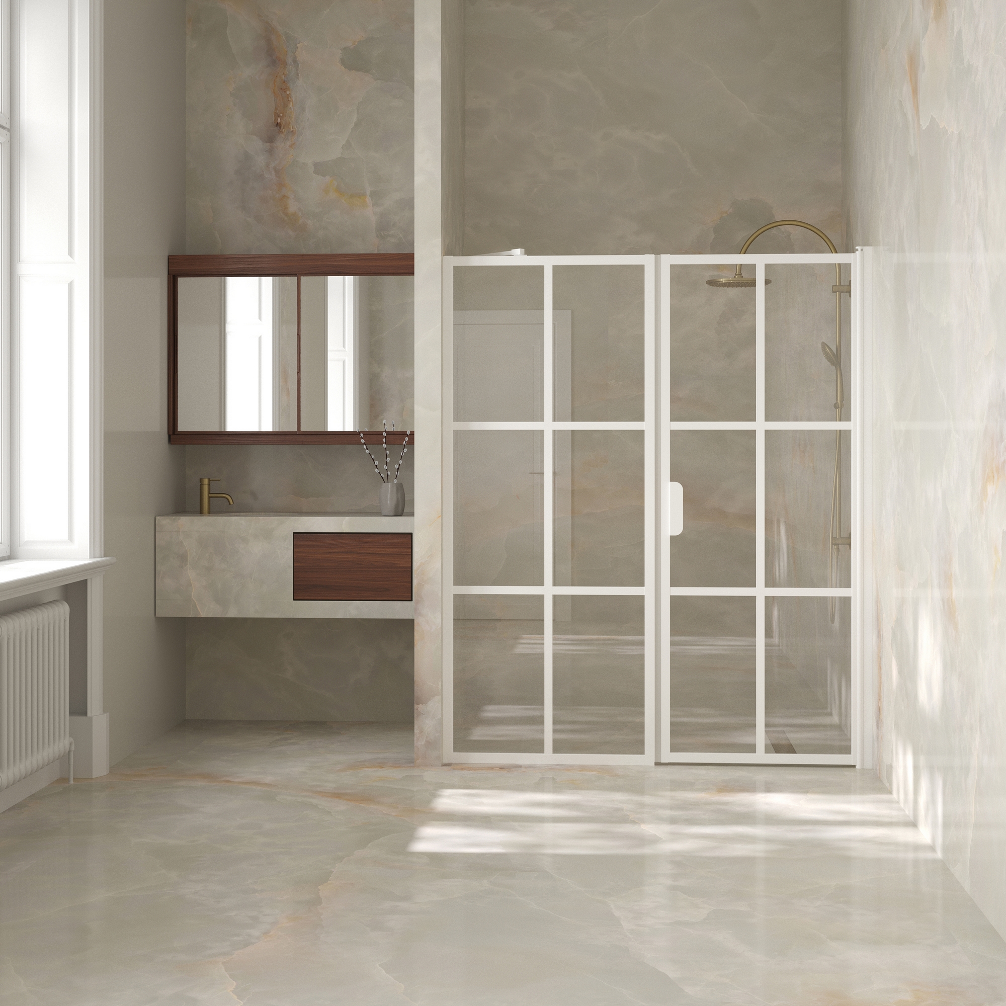 Duschdörr HietakariBläk 750 Paris Nisch Fast Vägg och Vändbar DörrFast Vägg (A) 909 x Vändbar Dörr (B) 907 mm, Klarglas, Vita Profiler