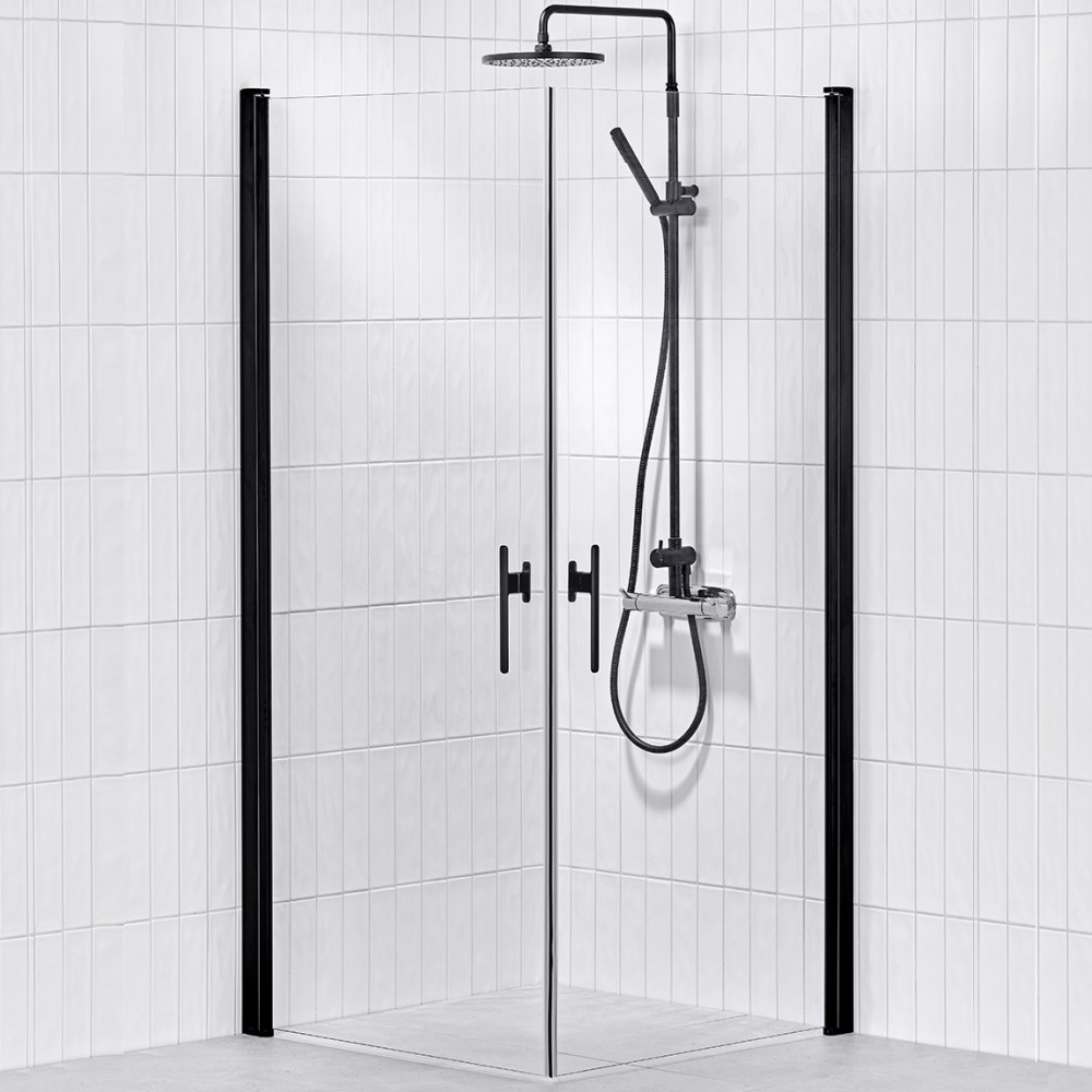 Duschhörn Alterna Lusso Rak Lackerad Profil är en modern duschhörna som har raka dörrar samt väggprofiler och är tillverkad i 6 mm härdat säkerhetsglas med 3M-behandling. Duschhörnan levereras komplett med två duschdörrar, magnetlist, släplist, handtag eller dörrknopp och snabbfästen för enklare montering. Väggprofilerna kan justeras ±10 mm per dörr och de kan även öppnas inåt för platsbesparing. Dörrarna höjs 4 mm från golvet vid öppning för att undvika att de skrapar i golvet.