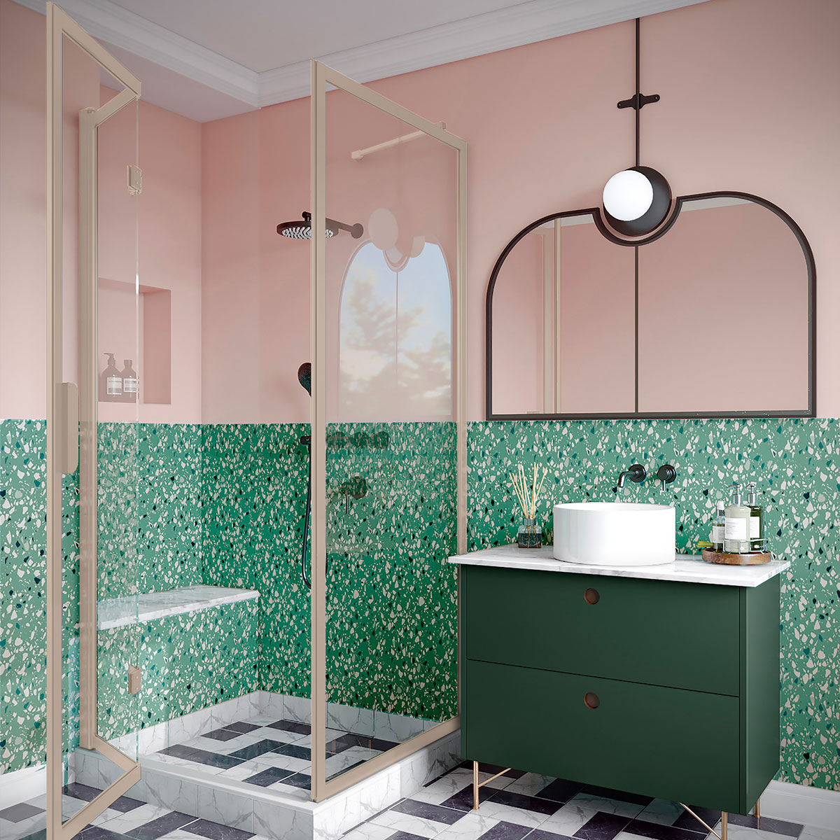 Duschhörn Hietakari Bläk 887 New York består av en fast vägg och en vikbar dörr, vilket gör den idealisk för hörnplacering där utrymmet är begränsat. Den är särskilt praktisk i hörn där det finns en möbel på ena sidan och där det andra sidan också är trång, vilket kan göra det svårt att öppna en vanlig dörr utåt. Den vikbara dörren kräver inget extra utrymme utanför duschutrymmet eftersom den viker sig inåt och glaset samlas kompakt mot väggen. Detta ger en smidig lösning, där den fasta väggen kan skydda möbeln och dörren kan anpassas för att passa det tillgängliga utrymmet.
