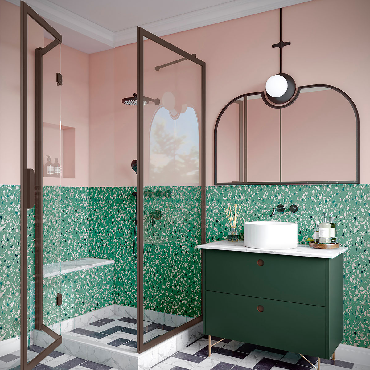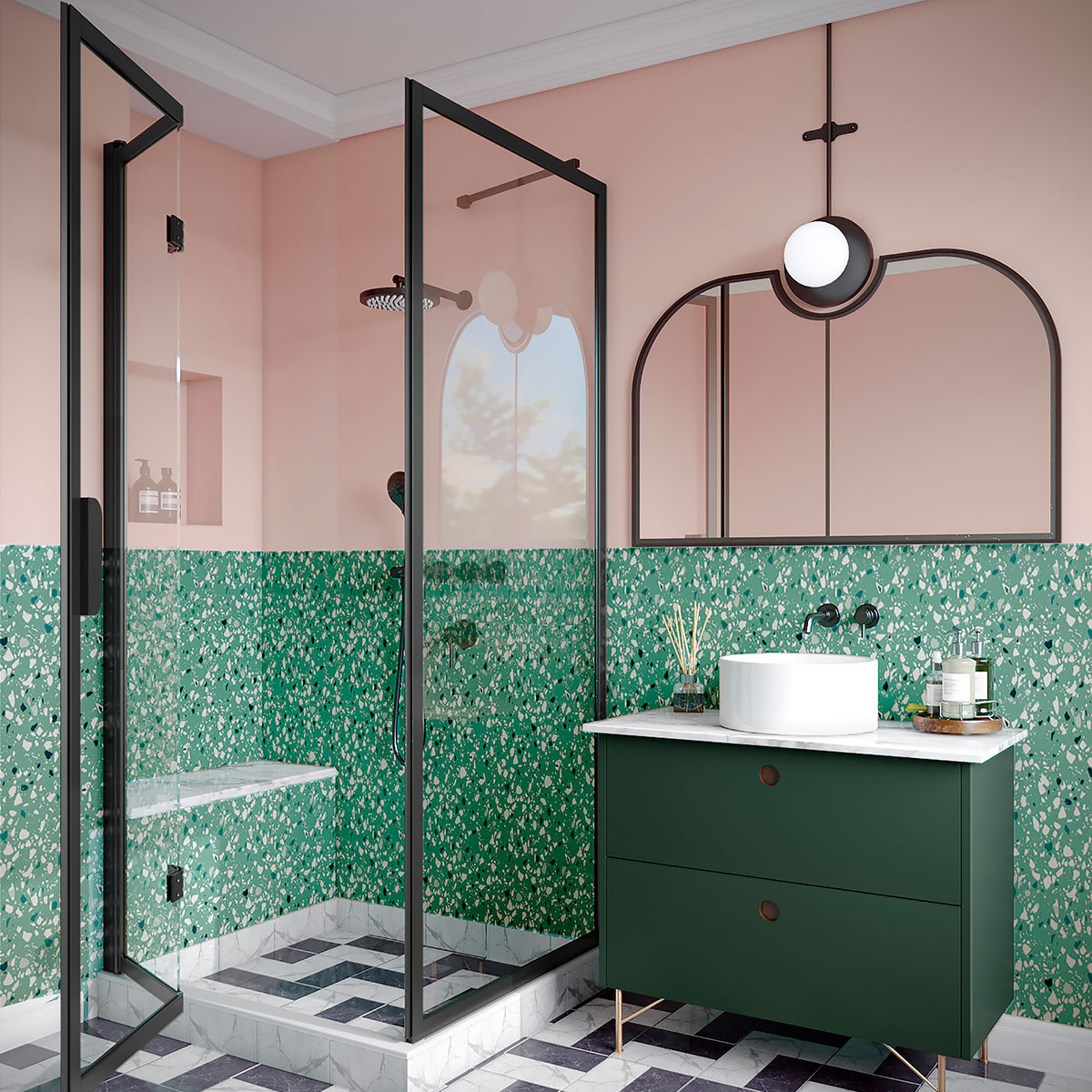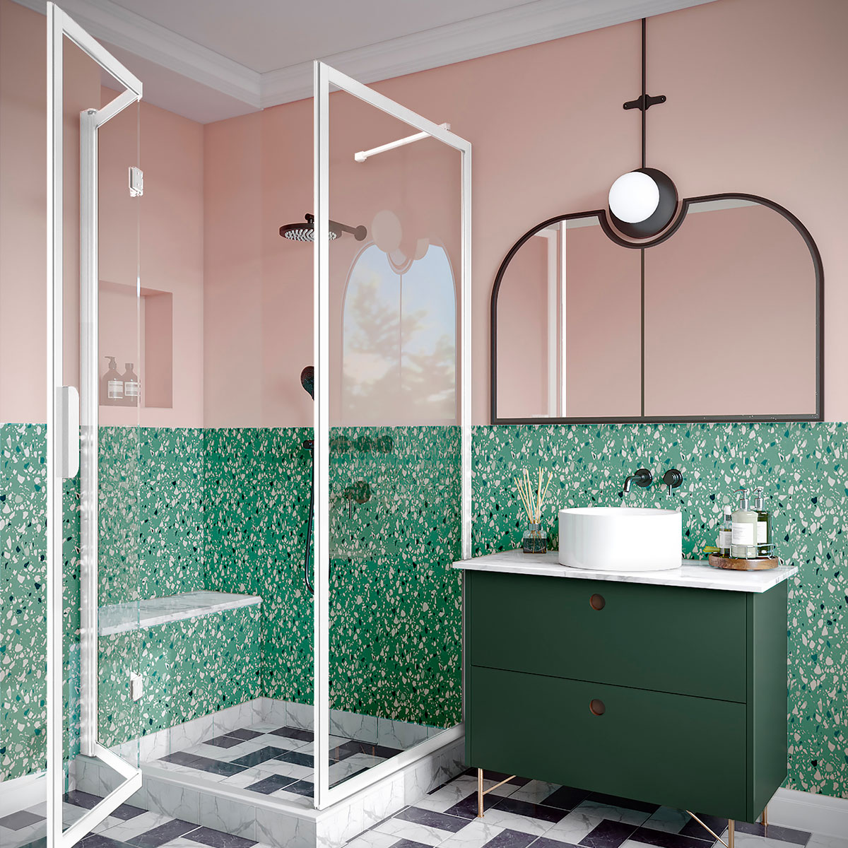 Duschhörn Hietakari Bläk 887 New York består av en fast vägg och en vikbar dörr, vilket gör den idealisk för hörnplacering där utrymmet är begränsat. Den är särskilt praktisk i hörn där det finns en möbel på ena sidan och där det andra sidan också är trång, vilket kan göra det svårt att öppna en vanlig dörr utåt. Den vikbara dörren kräver inget extra utrymme utanför duschutrymmet eftersom den viker sig inåt och glaset samlas kompakt mot väggen. Detta ger en smidig lösning, där den fasta väggen kan skydda möbeln och dörren kan anpassas för att passa det tillgängliga utrymmet.