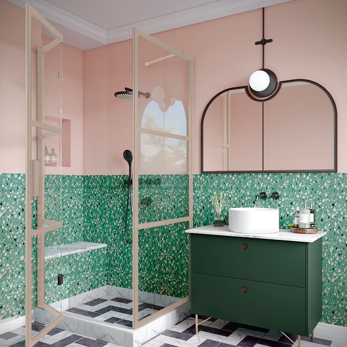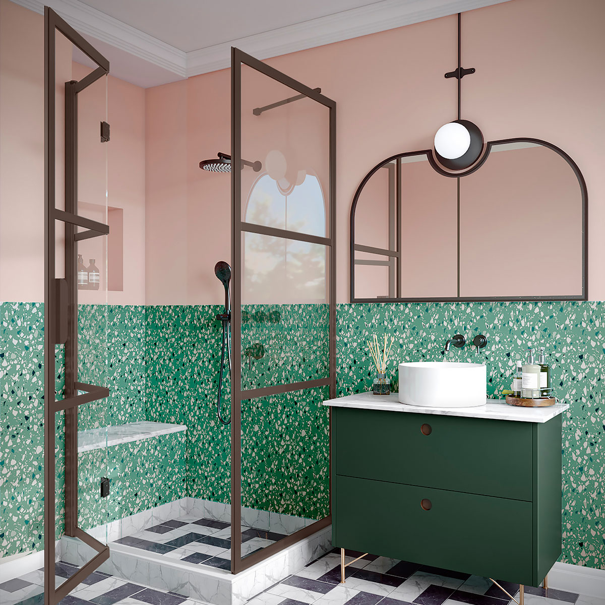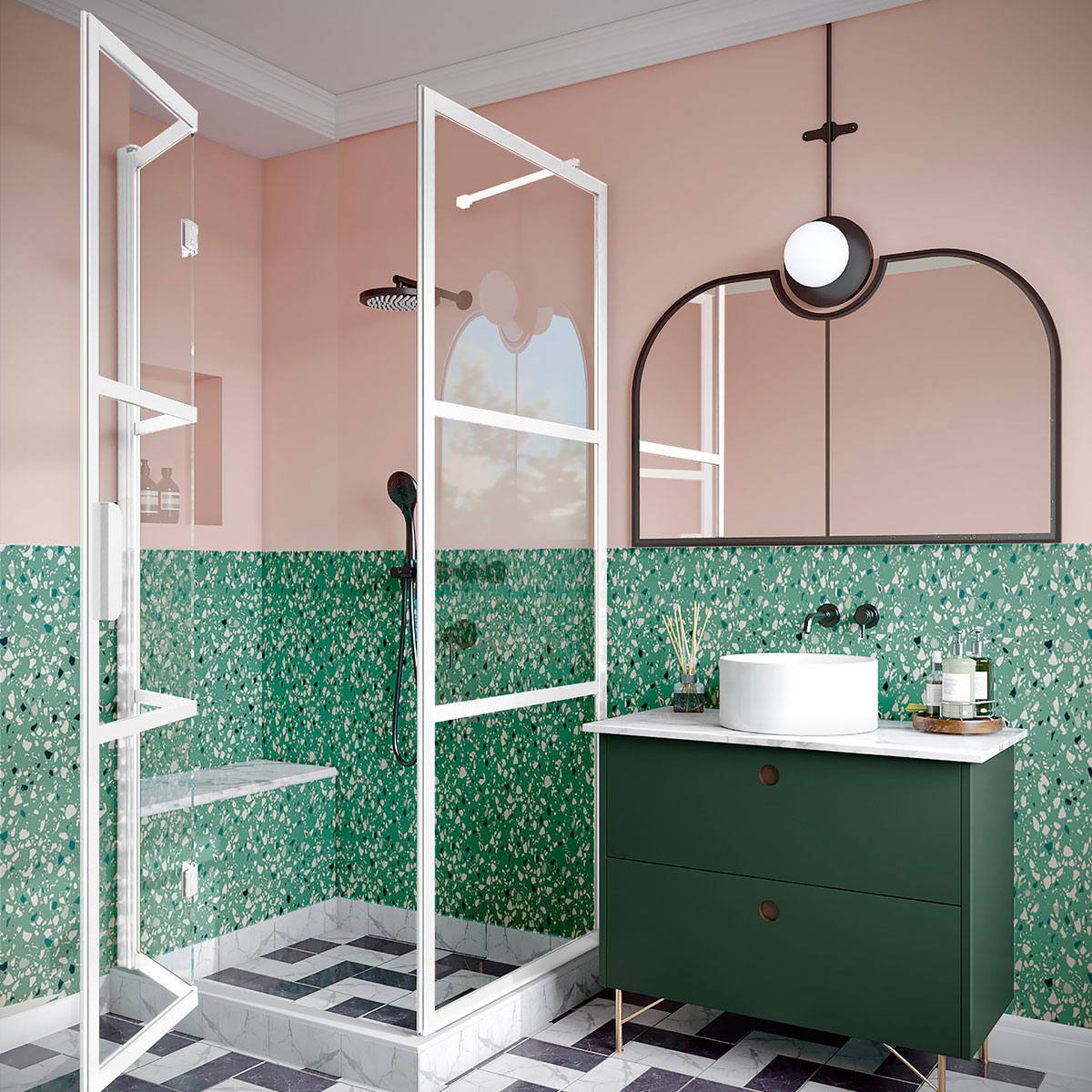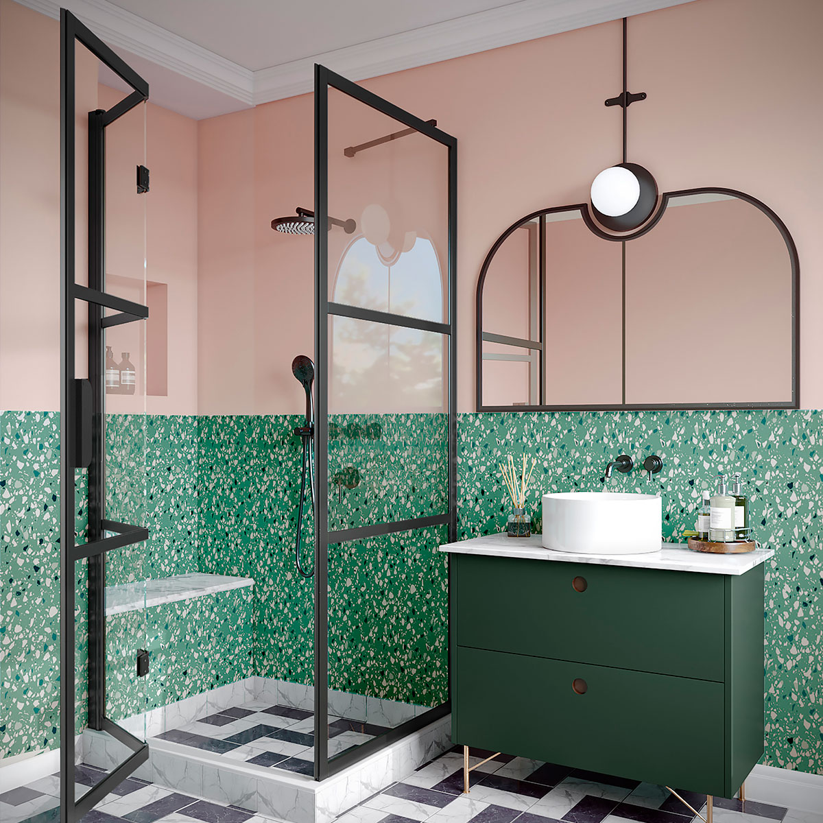 Duschhörn Hietakari Bläk 888 Tokyo består av en fast vägg kombinerad med en vikbar dörr, vilket gör den idealisk för hörn där utrymmet är begränsat. Produkten är särskilt praktisk i badrum där det finns en möbel intill duschen på ena sidan och ett trångt utrymme på den andra sidan, vilket gör att en traditionell dörr som öppnas utåt inte skulle fungera. Den vikbara dörren öppnas istället inåt, vilket innebär att inget extra utrymme behövs utanför duschen. När dörren öppnas, viks glaspartierna smidigt inåt mot väggen och tar minimalt med plats. Den fasta väggen kan anpassas i storlek för att skydda möbeln intill, medan dörren kan utformas så att den matchar det tillgängliga gångutrymmet.
