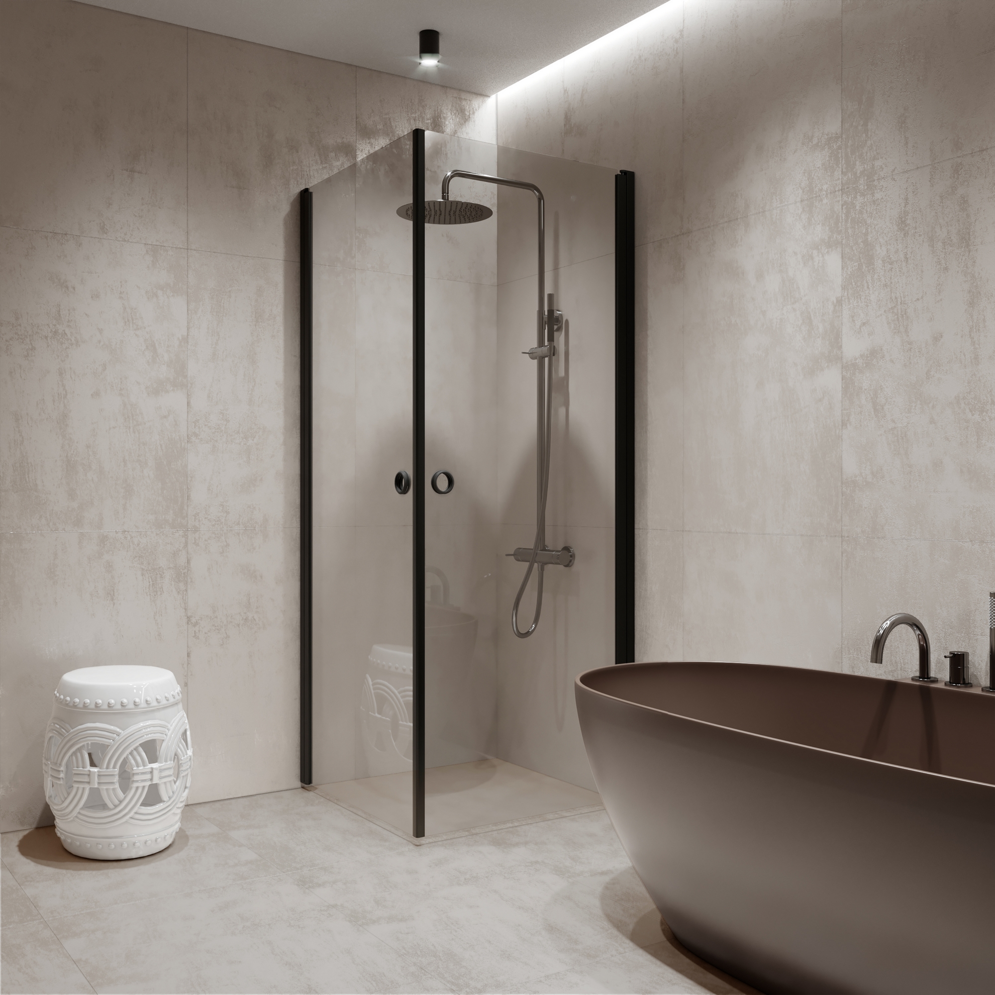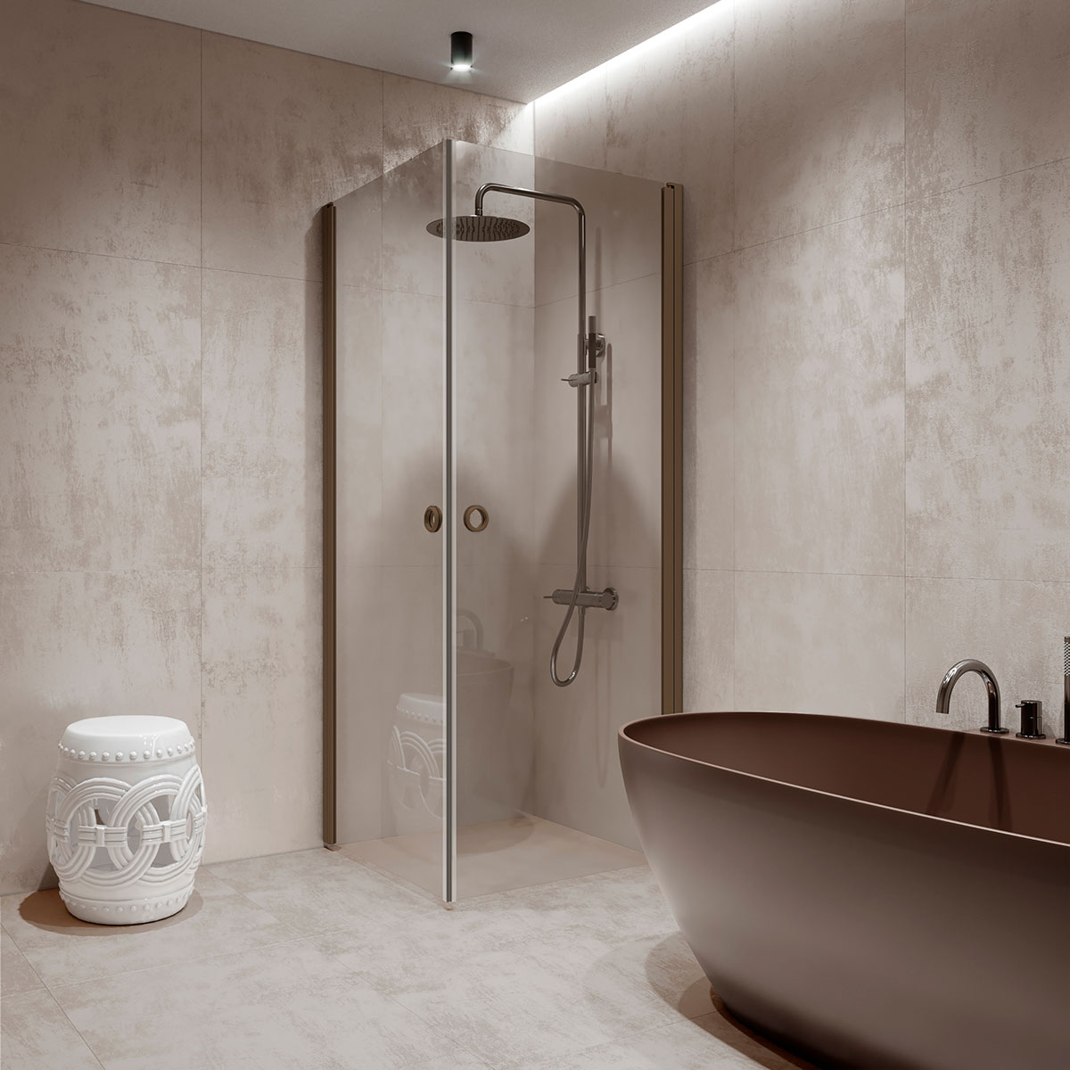 När duschen inte används kan duschdörrarna vändas mot väggen. Dörrarna vänds 90 grader i bägge riktningarna och förses med justerbar centrering. Centreringen strävar efter att återställa duschväggen till öppen respektive stängd position. Dörren är försedd med lyftgångjärn.