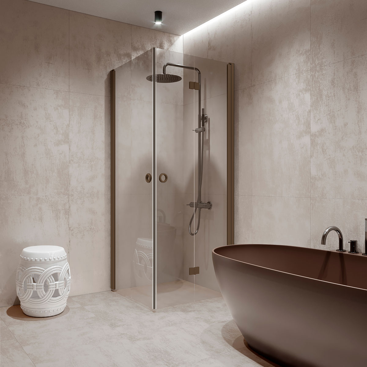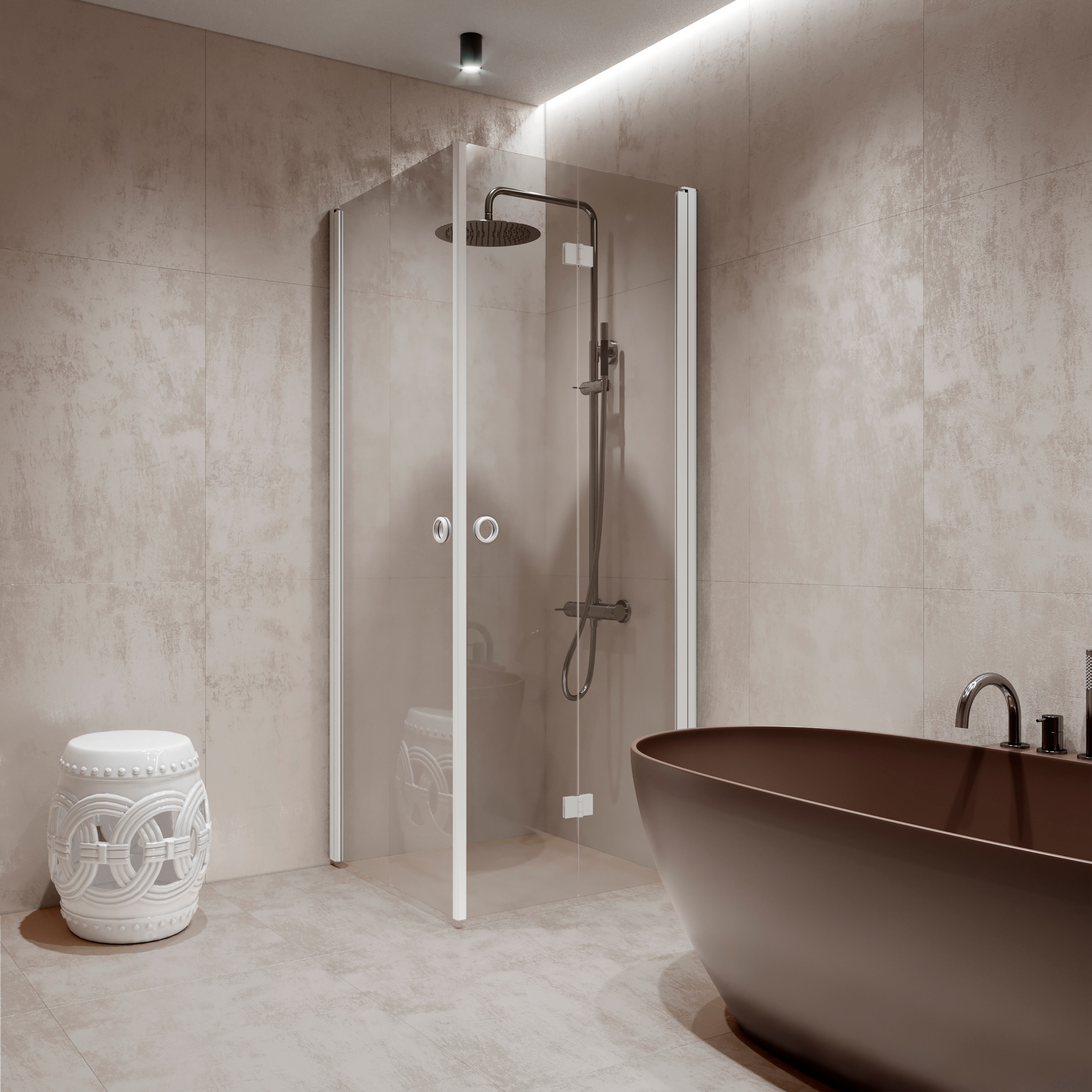 När duschen inte används kan duschdörren vändas och vikas ihop mot väggen. Duschdörren vänds 90 grader i bägge riktningarna och förses med justerbar centrering. Centreringen strävar efter att återställa duschdörren till öppen respektive stängd position. Dörren är försedd med lyftgångjärn.