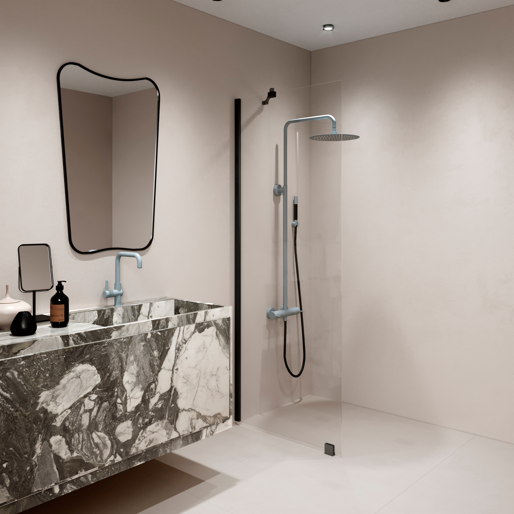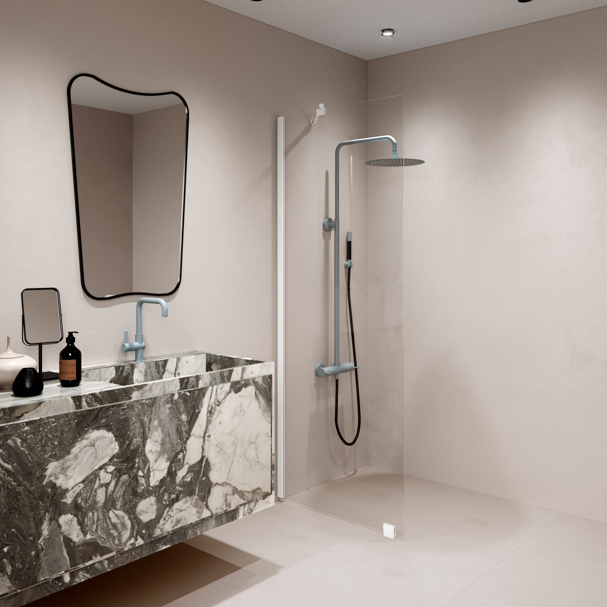 Duschvägg Hietakari Forma 301 är en fast duschvägg med stilren design. Den fasta väggen skyddar effektivt mot vattenstänk. Produkten förses med ett golvbeslag som monteras i golv och ett sidostag vars position kan väljas fritt mot väggen. Istället för det sneda sidostaget, kan man välja duschväggen med ett långt sidostag, som installeras i 90 graders vinkel som finns att köpa som tillval vid beställningen.