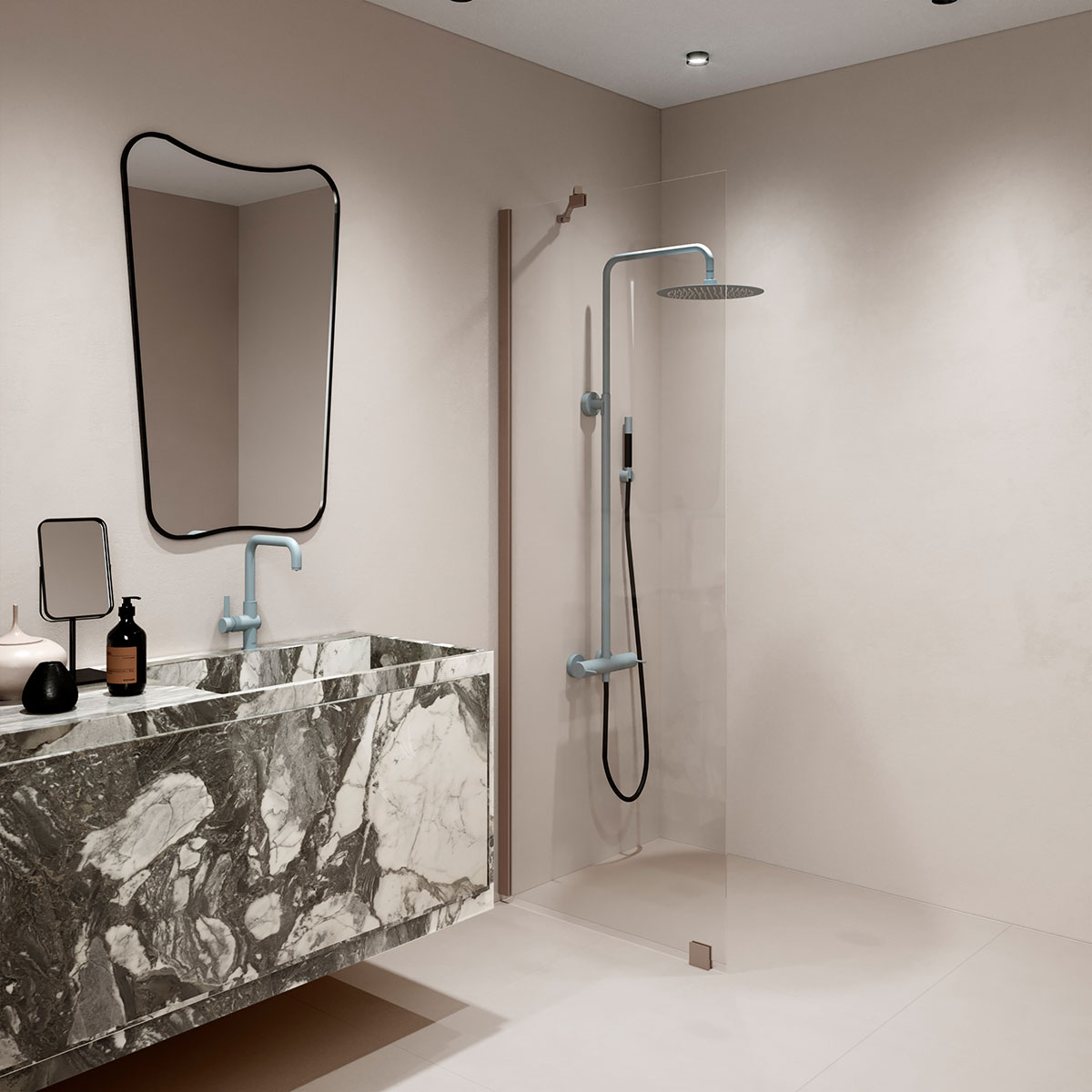 Duschväggen finns att välja i olika utförande. Klarglas är jämn till ytan och genomskinlig. Reeded - glaset består av parallella linjer vilket suddar ljuset så att figuren bakom inte är helt tydlig. Satinglaset är suddigt och detaljer kan inte ses genom glaset. Ena sidan av satinglaset är sammetslik etsad medan andra sidan är jämn. Vid val av satinglas, bör beaktas att etsade sidan är ömtålig för repor och fläckar.
