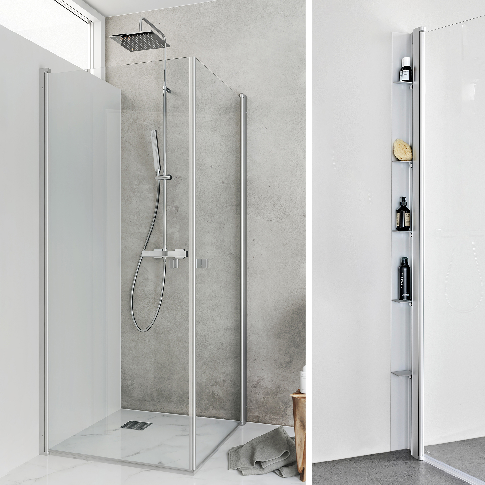 Skapar mycket förvaring i duschen för alla flaskor och prylar samtidigt som den skapar visuell harmoni genom att hålla dem utom synhåll – smidigt och snyggt. I duschhyllan finns 5 hyllplan, vilka kan justeras i höjdled. Monteras mellan vägg och duschvägg eller duschdörr och är 100 mm bred. Det vill säga, om du i ditt badrum ska ha en 90x90 cm duschlösning inklusive Place duschhylla, ska du beställa en 90x80 duschlösning där sidan som är 80 cm är den där Place duschhylla monteras.