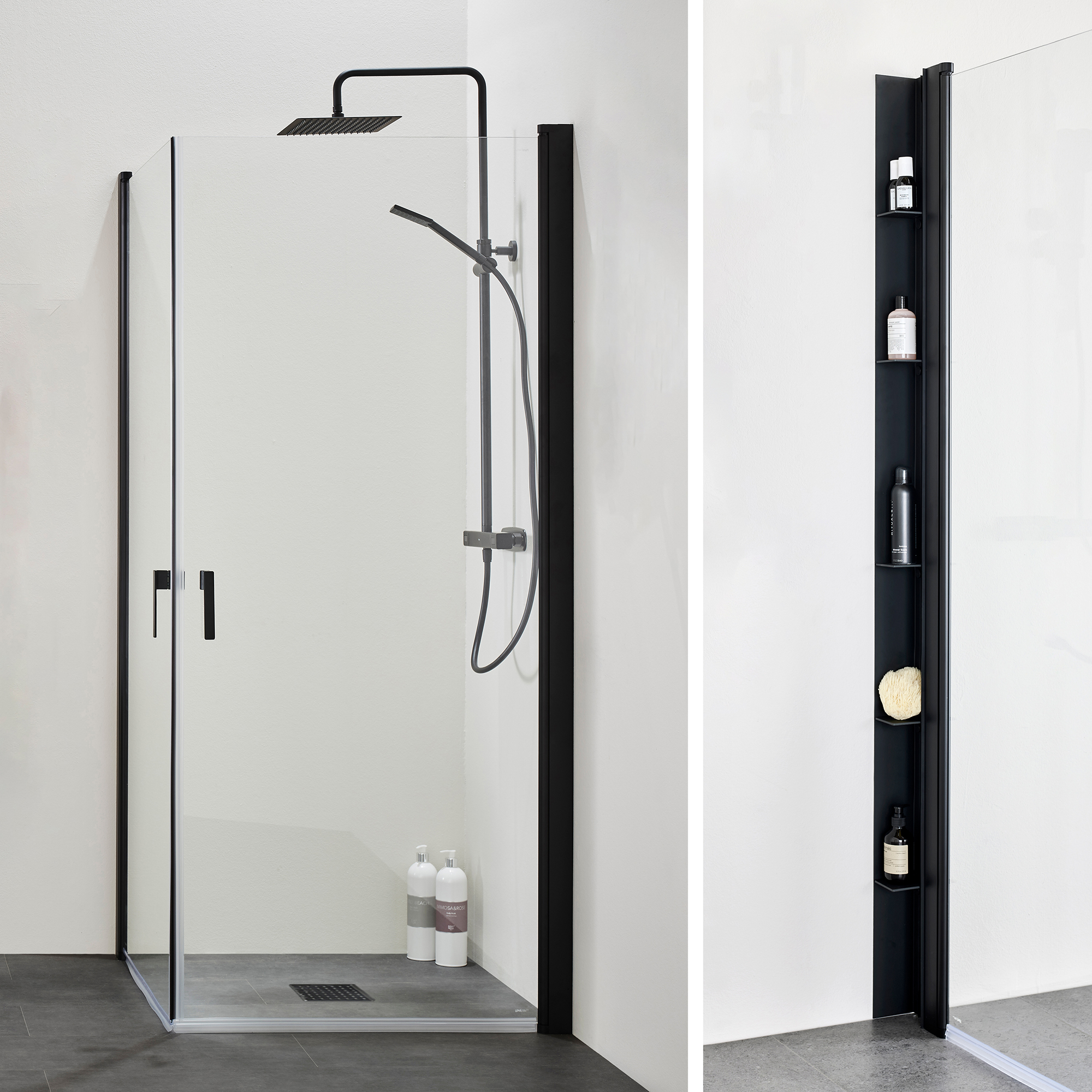 Duschhörn Igloo Pro med duschhylla Place från Hafa. Kombinerar smart design för både form och funktion. Ett rymligt duschörn med raka duschdörrar i klart glas och profiler i svart matt eller aluminium. När duschen inte används kan duschdörrarna vinklas in mot väggen vilket frigör plats i badrummet.